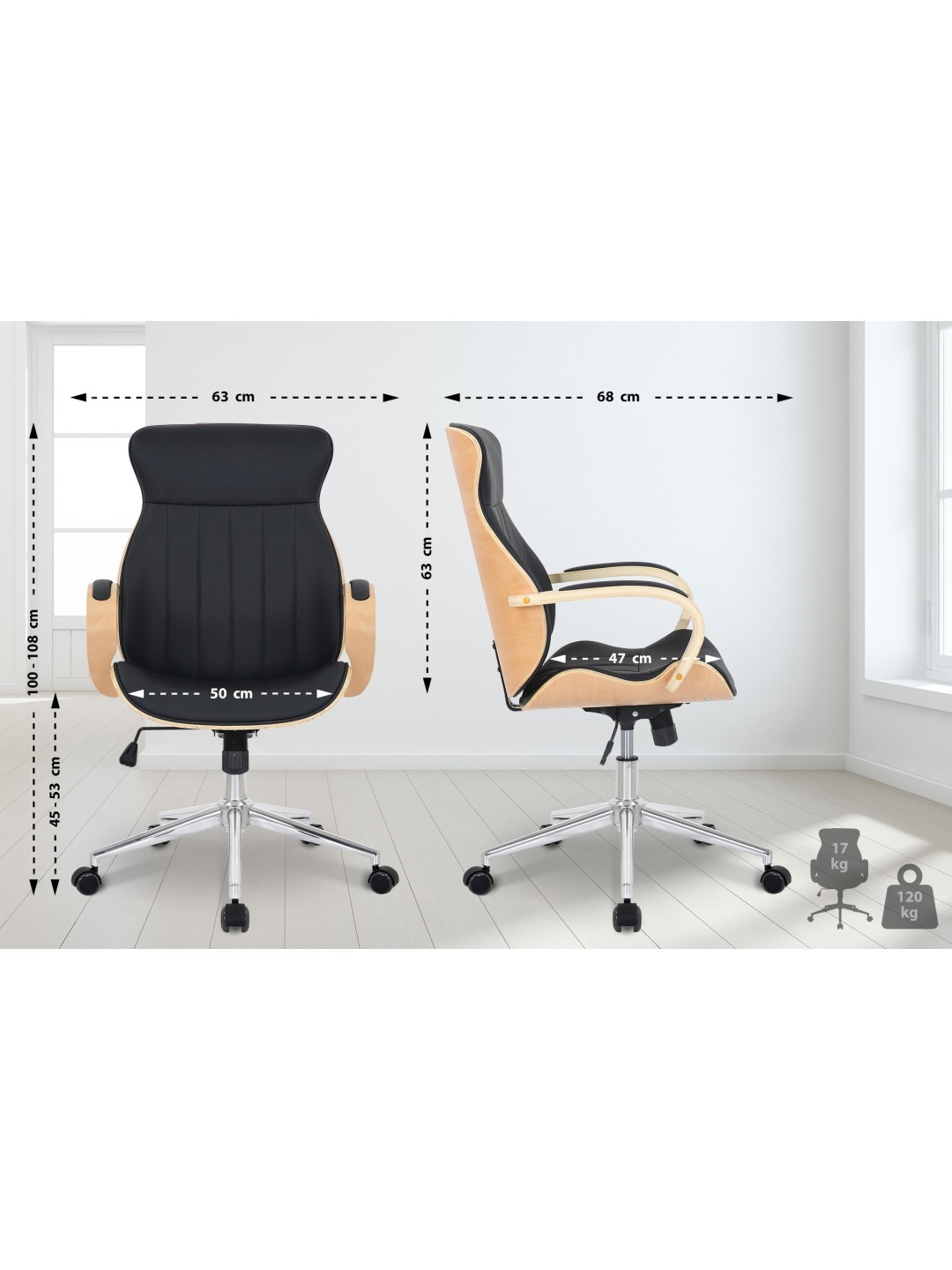 El asiento regulable en altura (45-53 cm) y el respaldo inclinable, que se puede fijar en la posición preferida, permiten sentarse ergonómicamente durante períodos más prolongados. Con una capacidad de carga de hasta 120 kg, esta silla ofrece estabilidad, mientras que la estructura de metal cromado garantiza durabilidad y una apariencia elegante.