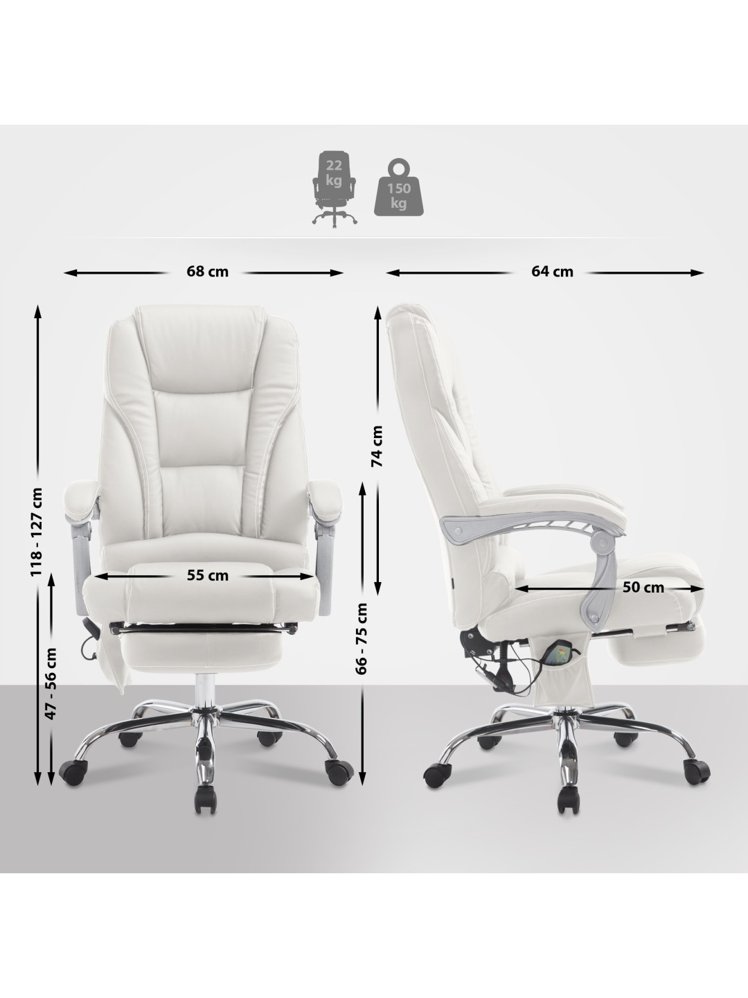 Esta silla de oficina tiene una función de masaje de 7 puntos que se controla mediante un control remoto por cable. La silla se puede girar 360 grados y es ajustable en altura, lo que permite un ajuste individual. El respaldo se reclina y la silla cuenta con un acolchado grueso para mayor comodidad. También están integrados una función de vibración y un temporizador. La silla es basculante y se puede fijar en diferentes posiciones. También hay disponible un reposapiés.