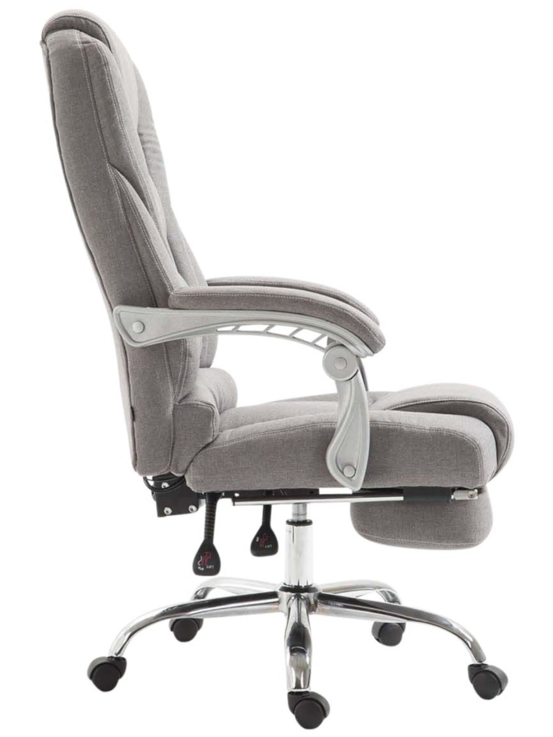 Esta impresionante silla de oficina Pacific convence no sólo por su aspecto elegante, sino también por su comodidad y durabilidad. Su buen acolchado y su funda de tela de fácil cuidado con elegantes costuras decorativas garantizan una sensación cómoda al sentarse, incluso si permanece allí durante mucho tiempo. Gracias a la altura del asiento regulable de forma continua, la silla de oficina Pacific garantiza además un asiento ergonómico en todo momento. El reposapiés y el respaldo, fácilmente ajustables, garantizan además un agradable descanso en el que recostarse y levantar las piernas. Se sostiene de forma segura sobre cinco ruedas de marcha suave y una estructura de metal con aspecto cromado. No importa si se trata de suelos duros o alfombrados, siempre puedes rodar fácilmente y sin apretar por el suelo.