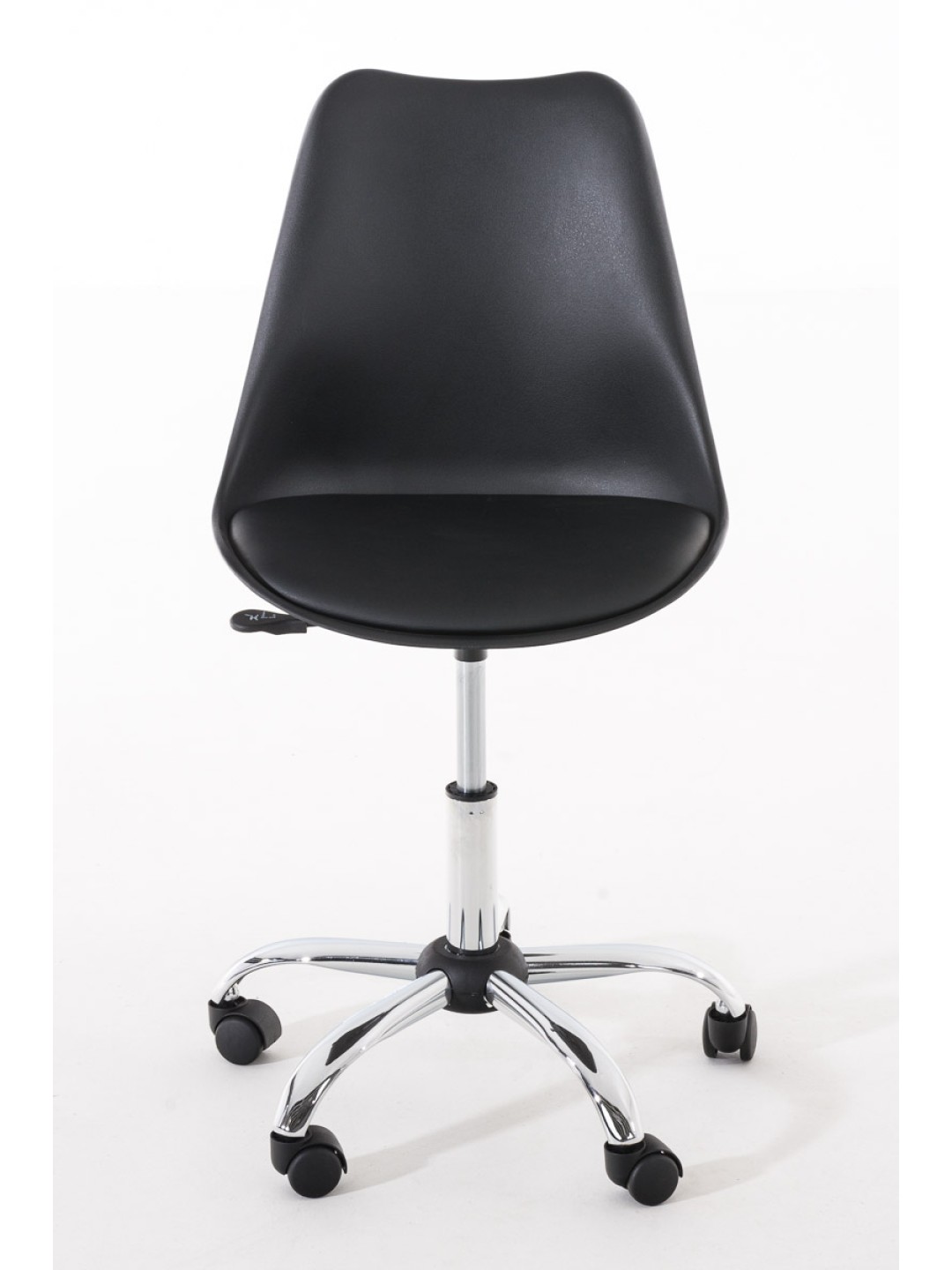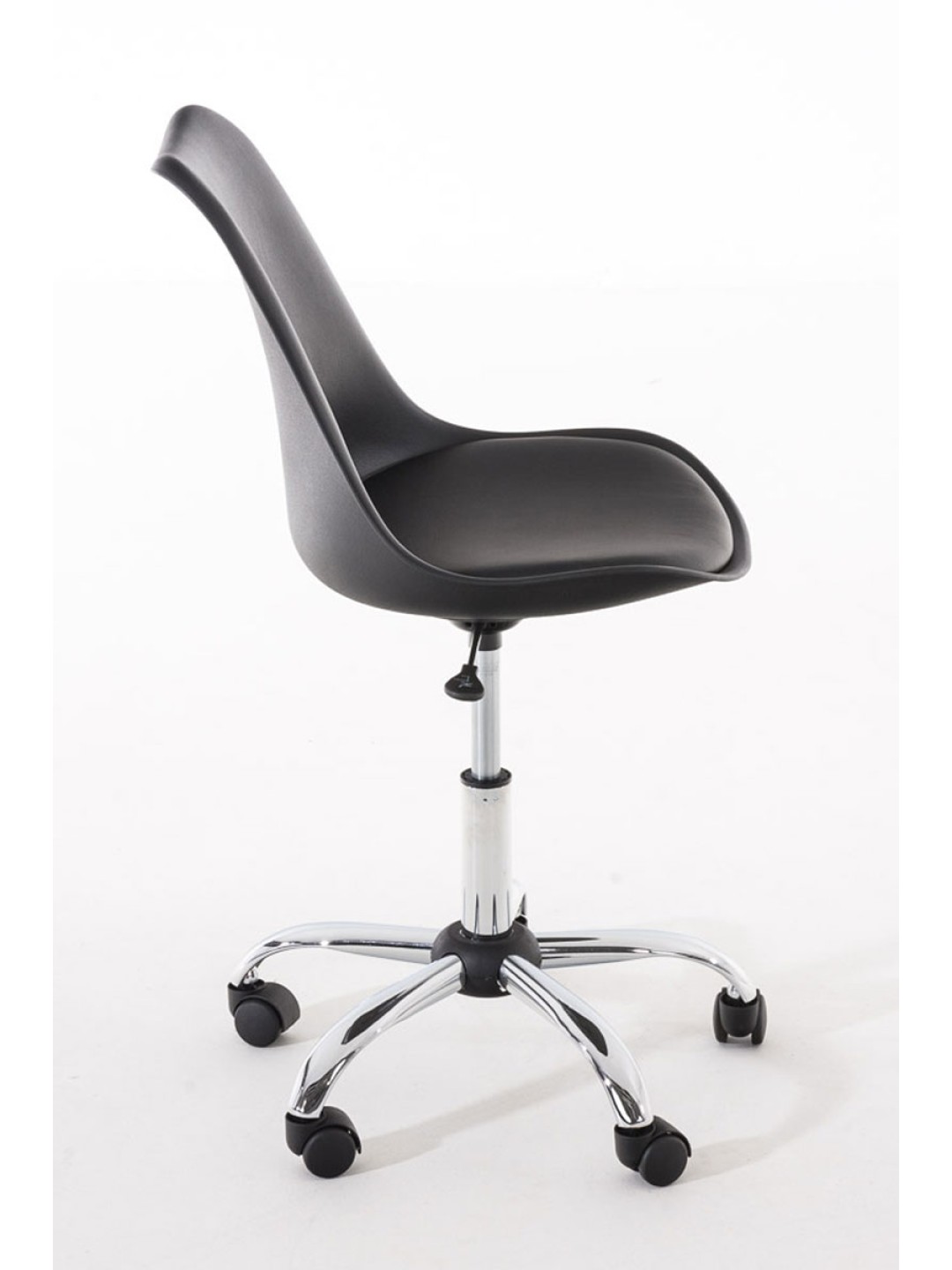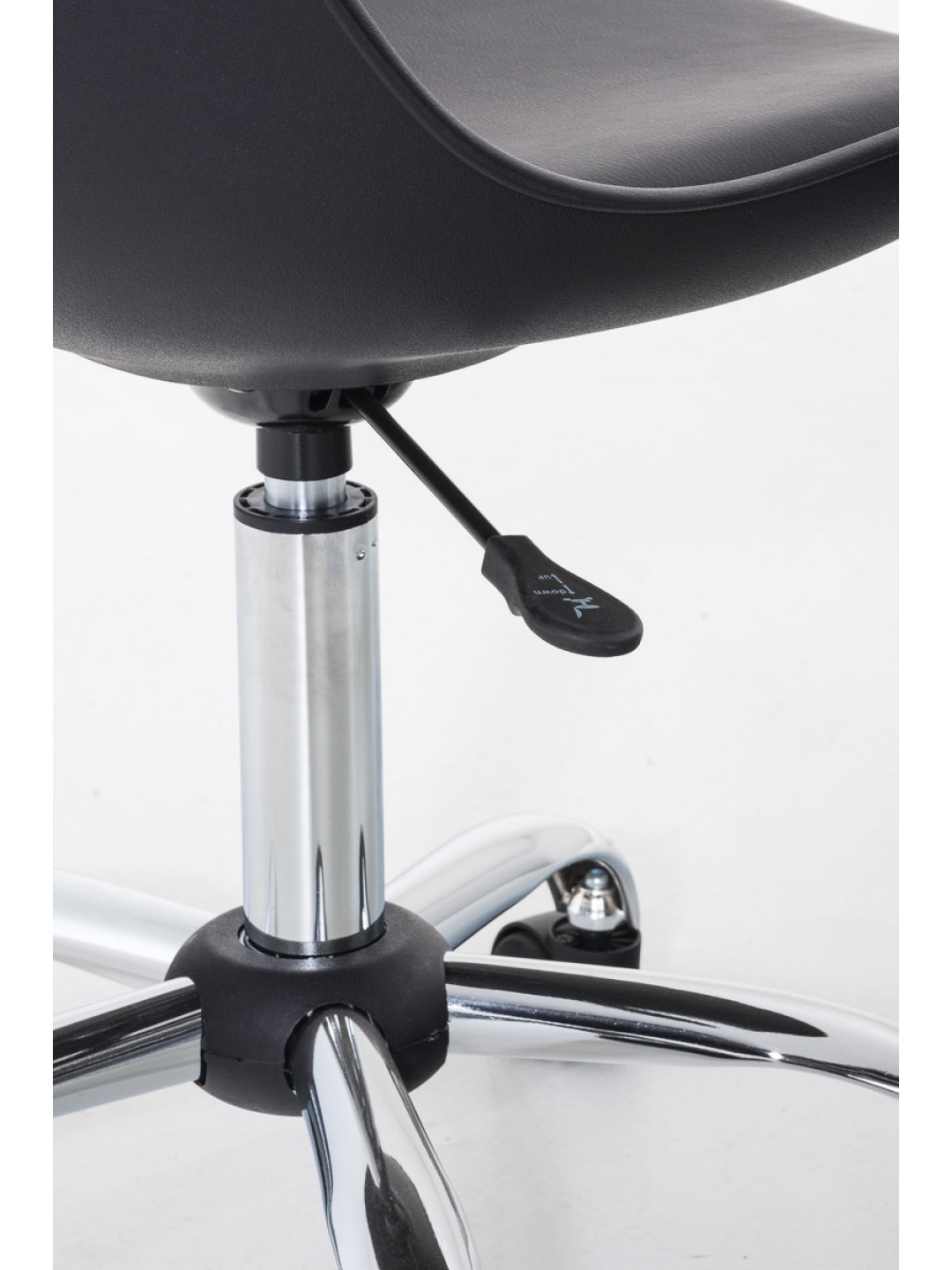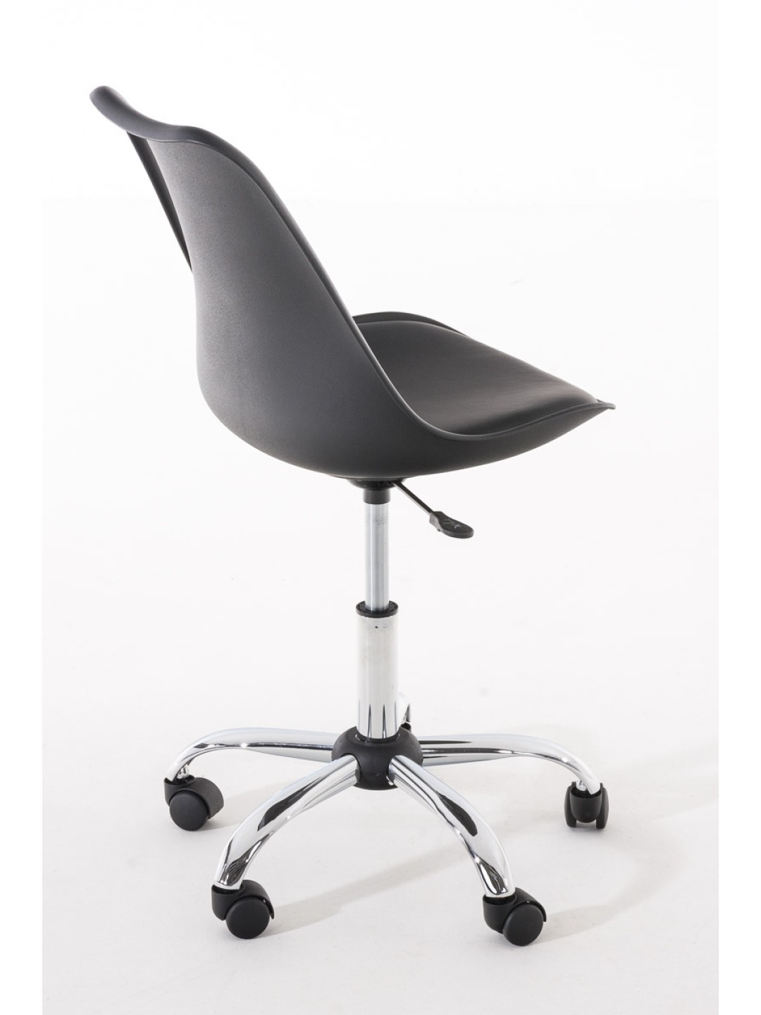 Esta silla de oficina convence por su diseño moderno y aporta a cualquier estudio un aspecto exclusivo. El taburete de trabajo no sólo convence por sus excelentes propiedades de asiento, sino también por su fascinante mezcla de materiales de plástico, cuero artificial y metal. La carcasa del asiento está fabricada de plástico resistente. El cómodo acolchado con funda de piel sintética permite sentarse cómodamente y el respaldo ofrece un alto nivel de comodidad durante el trabajo. Gracias a la altura ajustable del asiento se garantiza un asiento ergonómico. La altura del asiento se puede ajustar de forma continua mediante la palanca situada debajo del asiento. La robusta estructura está hecha de metal con aspecto cromado. La silla de oficina se apoya de forma segura sobre cinco ruedas de funcionamiento suave. No importa si se trata de suelos duros o alfombrados, siempre podrá rodar con facilidad y soltura por el suelo.