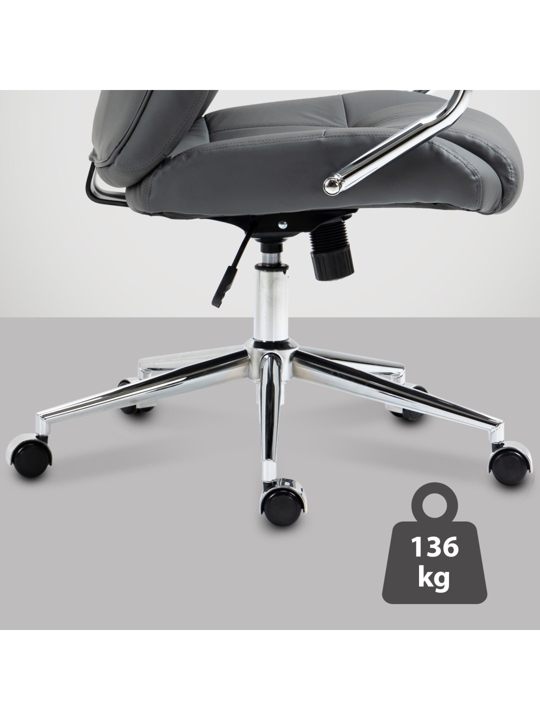 La silla de oficina se puede ajustar de forma flexible en cuanto a la altura del asiento y la tensión del mecanismo basculante. Gracias a su construcción estable, puede soportar hasta 136 kilogramos.