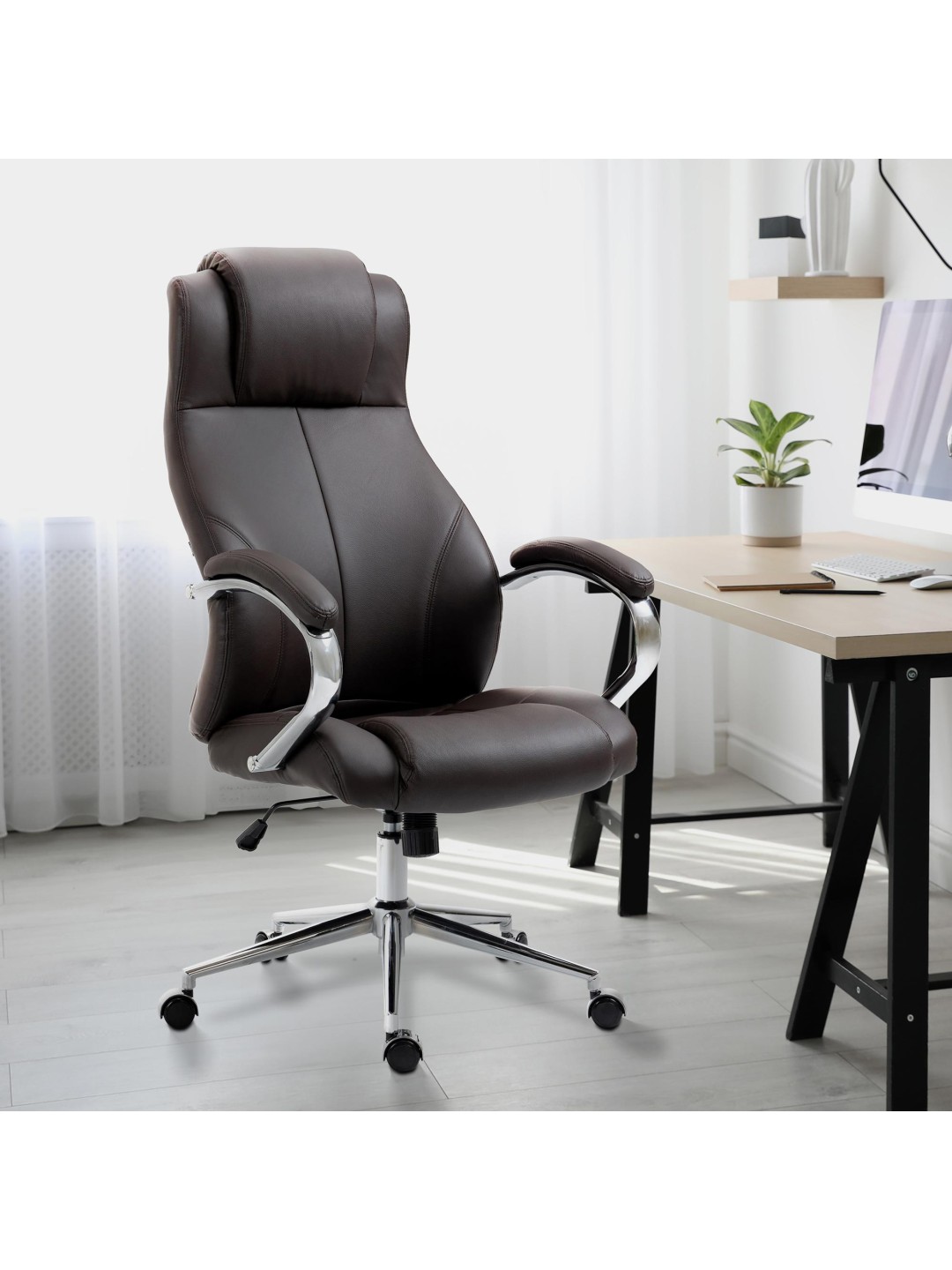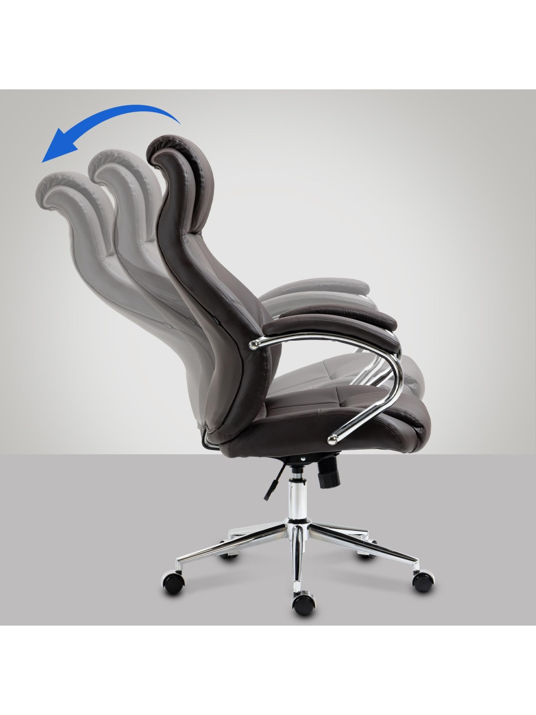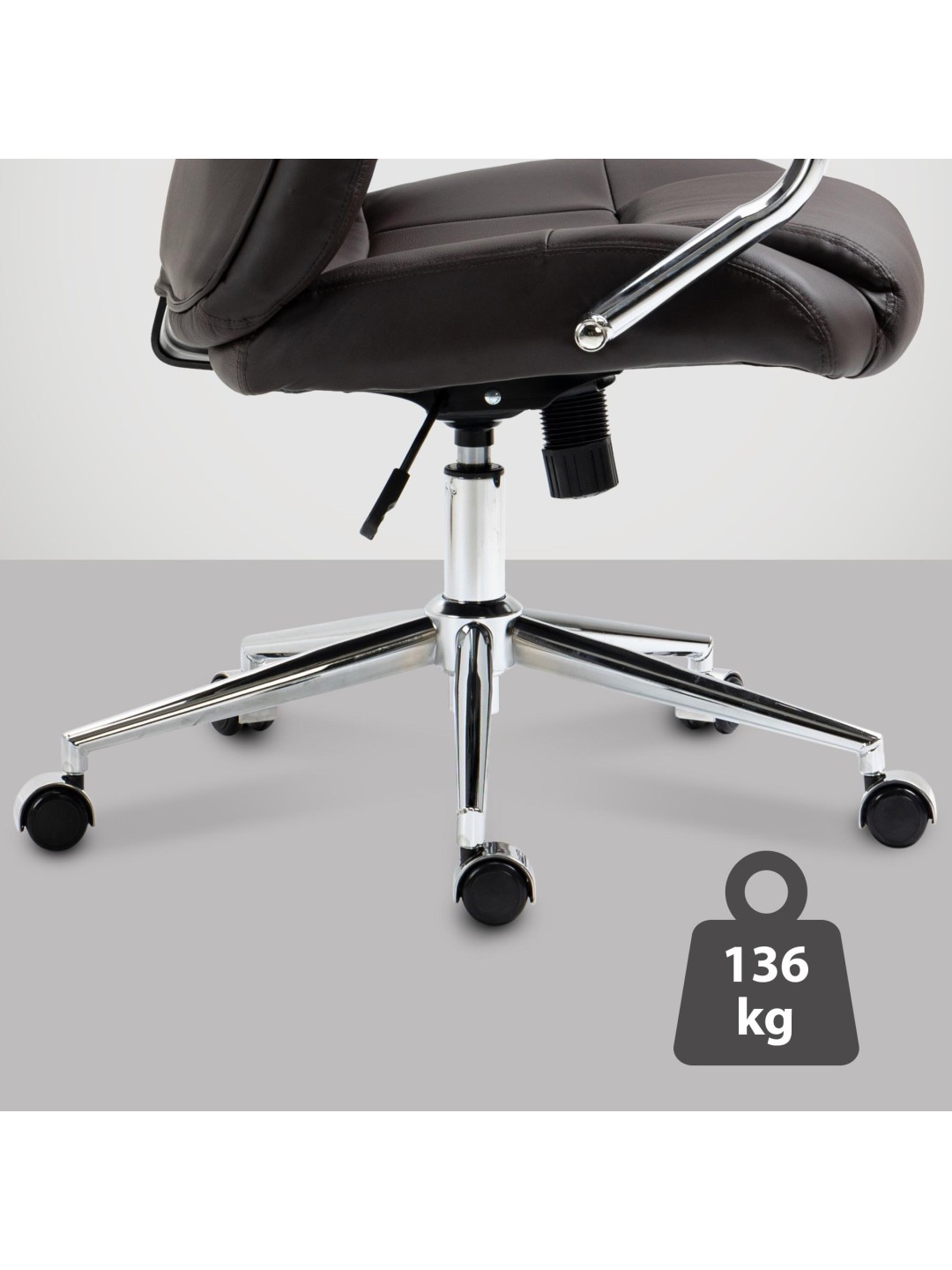 La tapicería tiene una funda de cuero genuino hecha de cuero de vaca duradero y la estructura de la silla es de metal con aspecto cromado. Con cinco ruedas de plástico móviles y de funcionamiento suave, la silla giratoria permite moverse sin esfuerzo en el área de trabajo.
