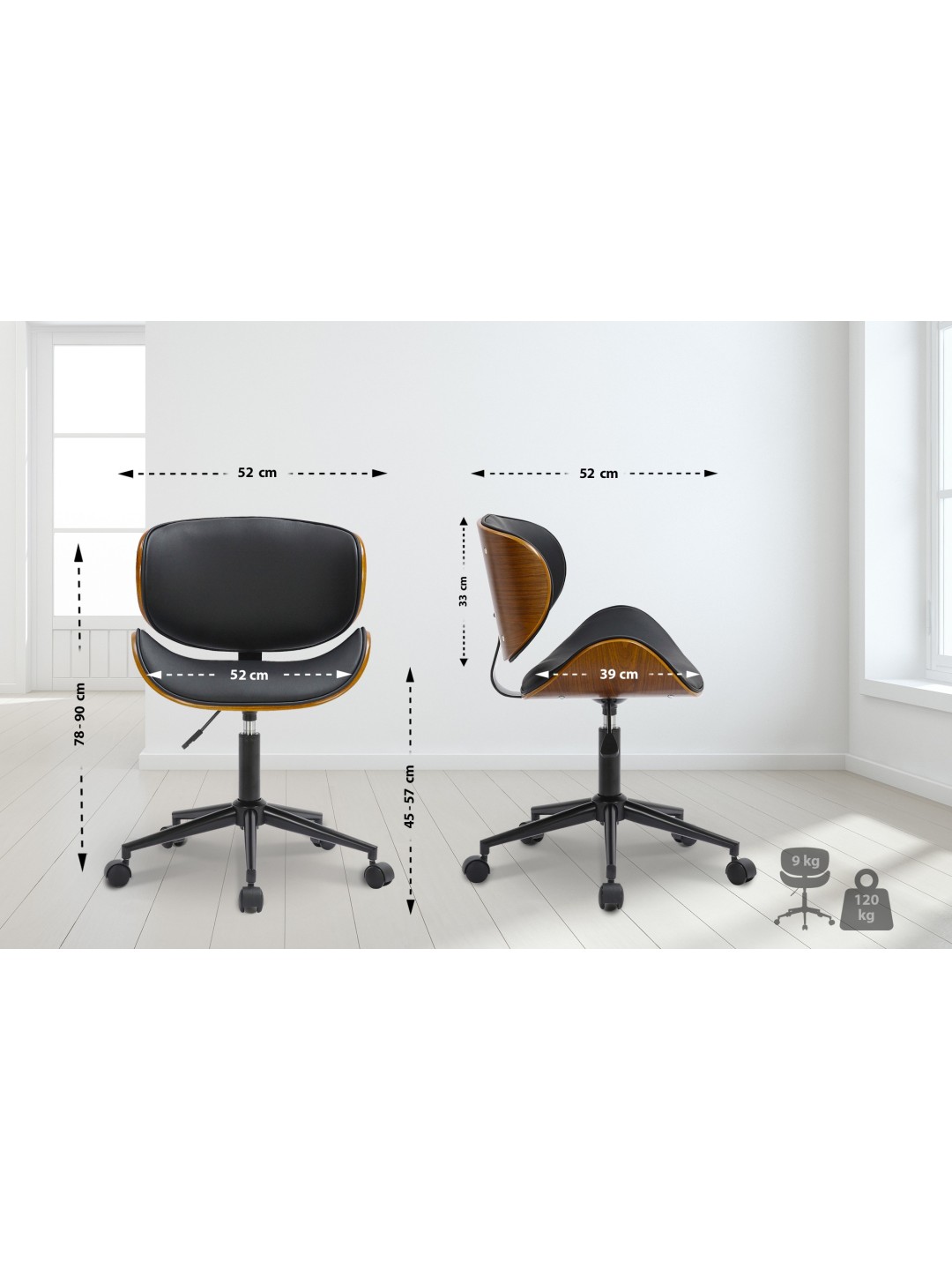 La capacidad de ajuste de altura permite un ajuste individual, mientras que la robusta estructura de metal con cinco ruedas de funcionamiento suave garantiza estabilidad y movilidad. La silla de escritorio también se puede girar alrededor de su propio eje.