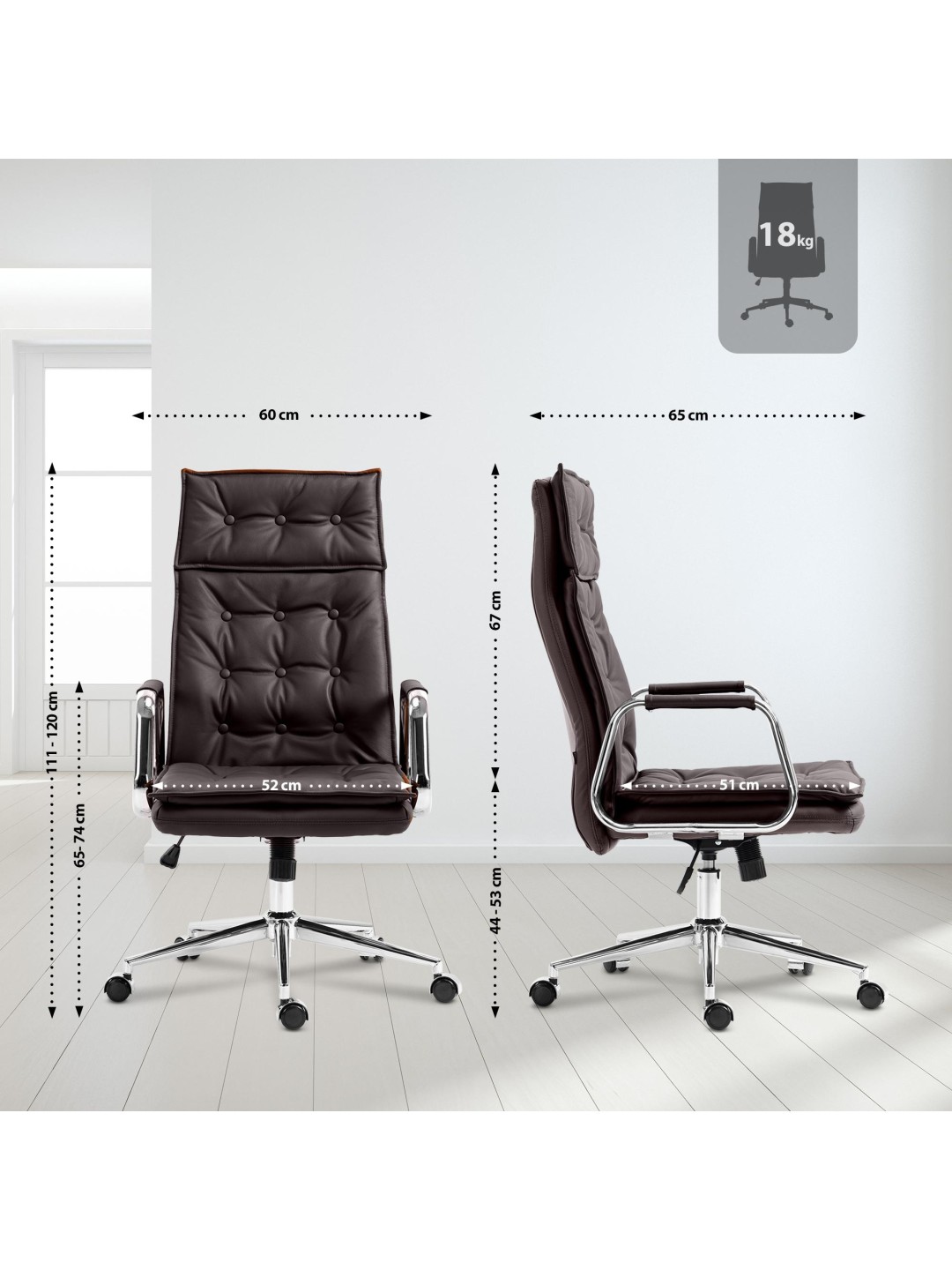 Se utilizó cuero de alta calidad para cubrir el asiento y el respaldo. La altura del asiento es infinitamente ajustable para que la silla de escritorio se pueda ajustar según el tamaño de su cuerpo. Además, la silla giratoria está equipada con un mecanismo de balanceo, lo que garantiza una mayor libertad de movimiento.