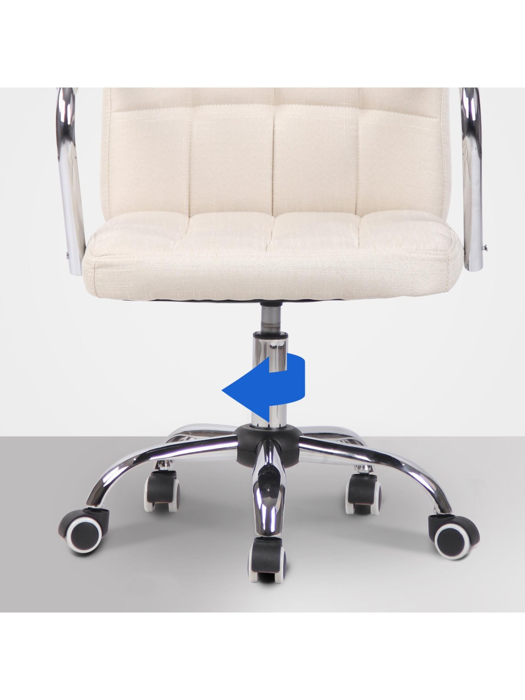 La silla giratoria se apoya de forma segura sobre una estructura de metal con aspecto cromado. Las cinco ruedas de marcha suave permiten un fácil movimiento y la silla de escritorio puede soportar con seguridad hasta 120 kilogramos.