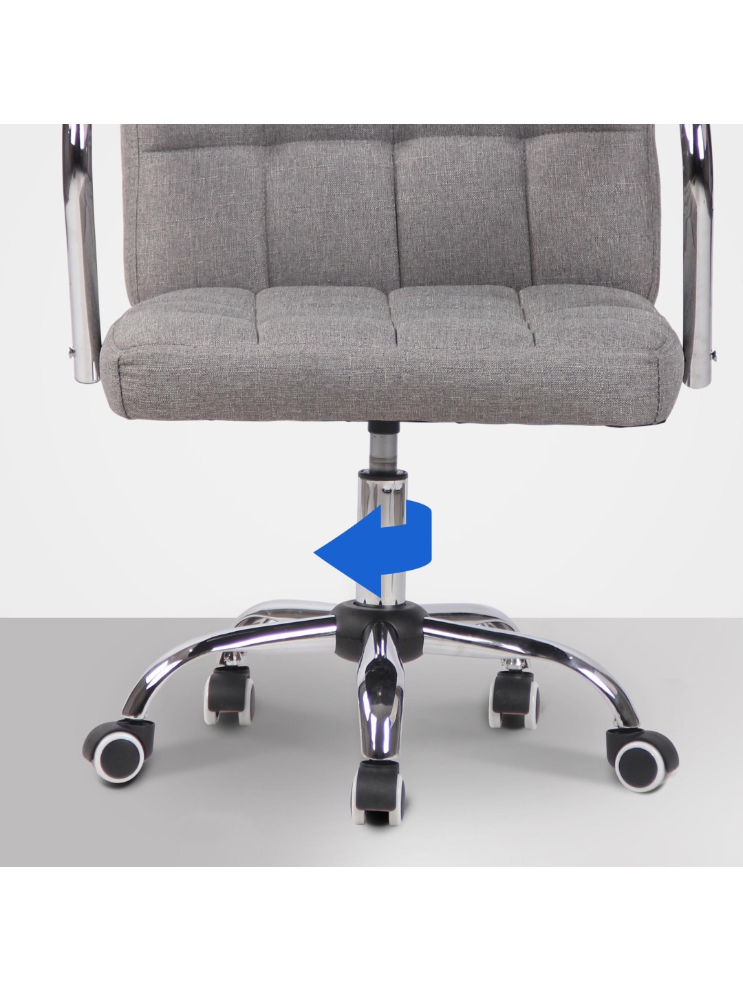 La silla giratoria se apoya de forma segura sobre una estructura de metal con aspecto cromado. Las cinco ruedas de marcha suave permiten un fácil movimiento y la silla de escritorio puede soportar con seguridad hasta 120 kilogramos.