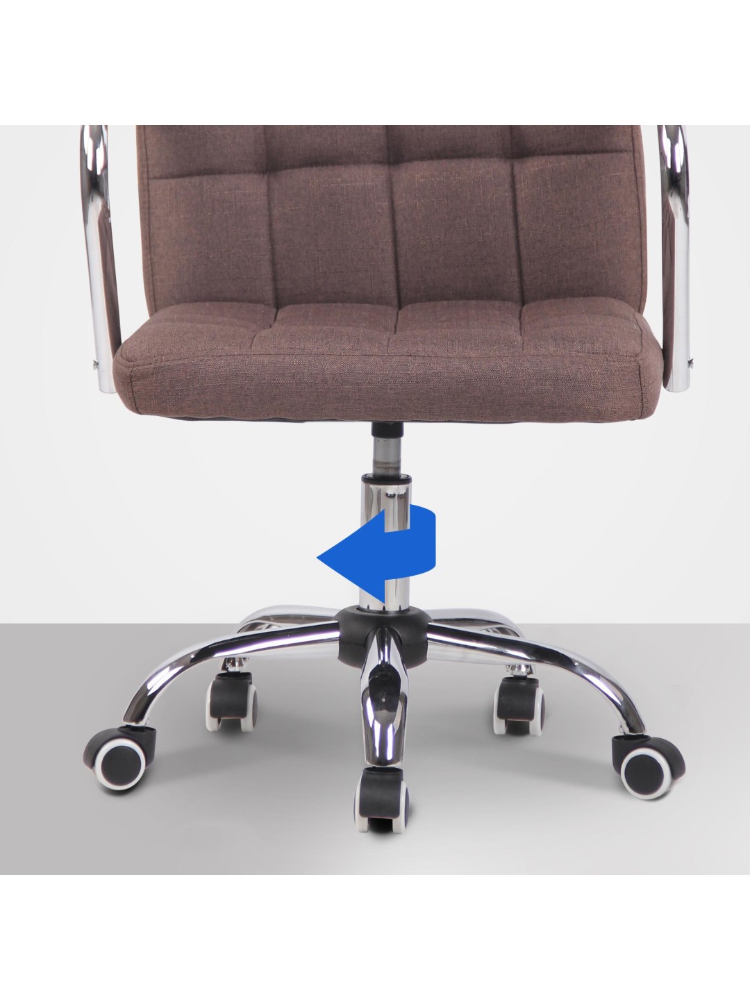 La silla giratoria se apoya de forma segura sobre una estructura de metal con aspecto cromado. Las cinco ruedas de marcha suave permiten un fácil movimiento y la silla de escritorio puede soportar con seguridad hasta 120 kilogramos.