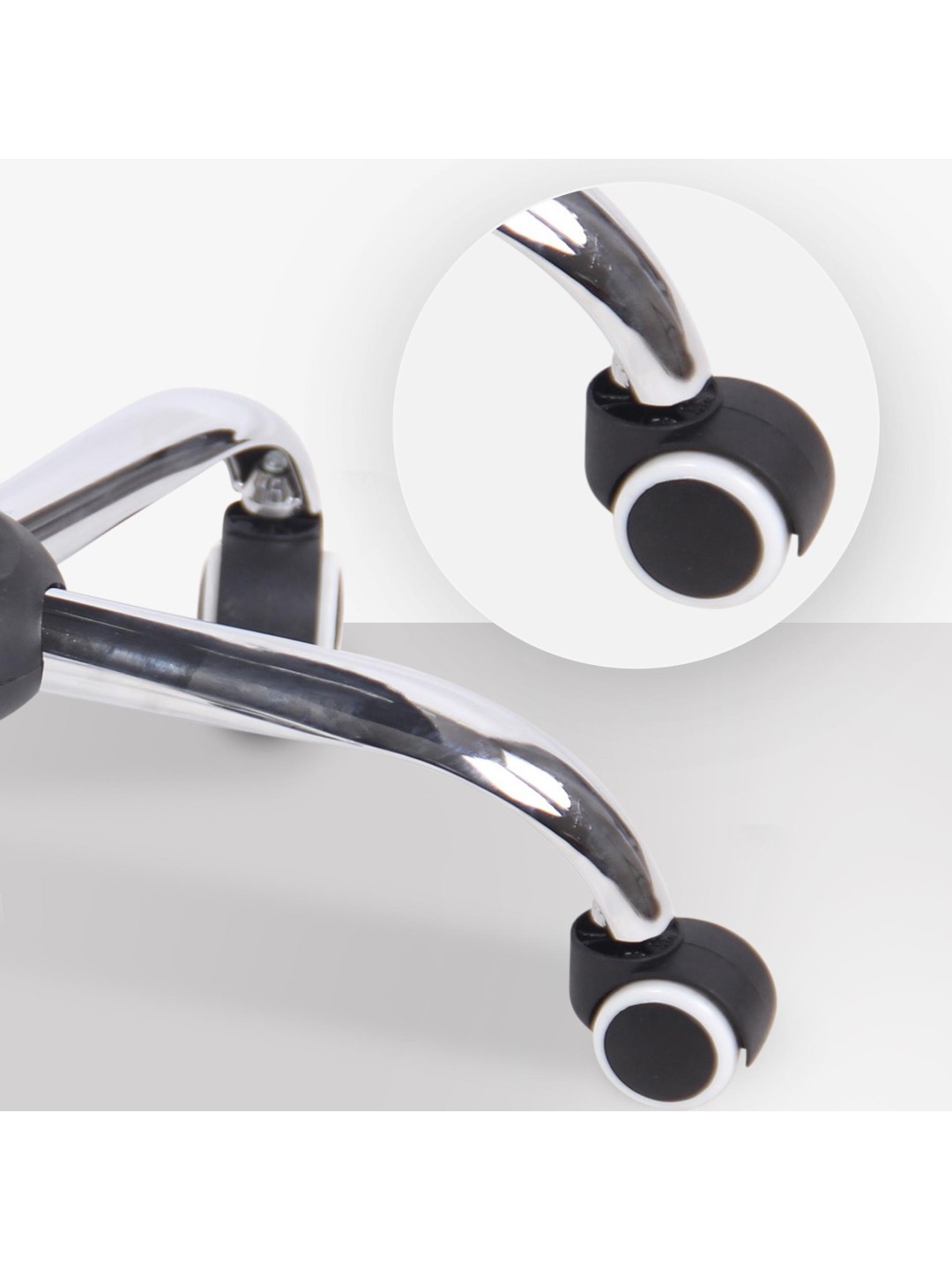 La silla giratoria se apoya de forma segura sobre una estructura de metal con aspecto cromado. Las cinco ruedas de marcha suave permiten un fácil movimiento y la silla de escritorio puede soportar con seguridad hasta 120 kilogramos.
