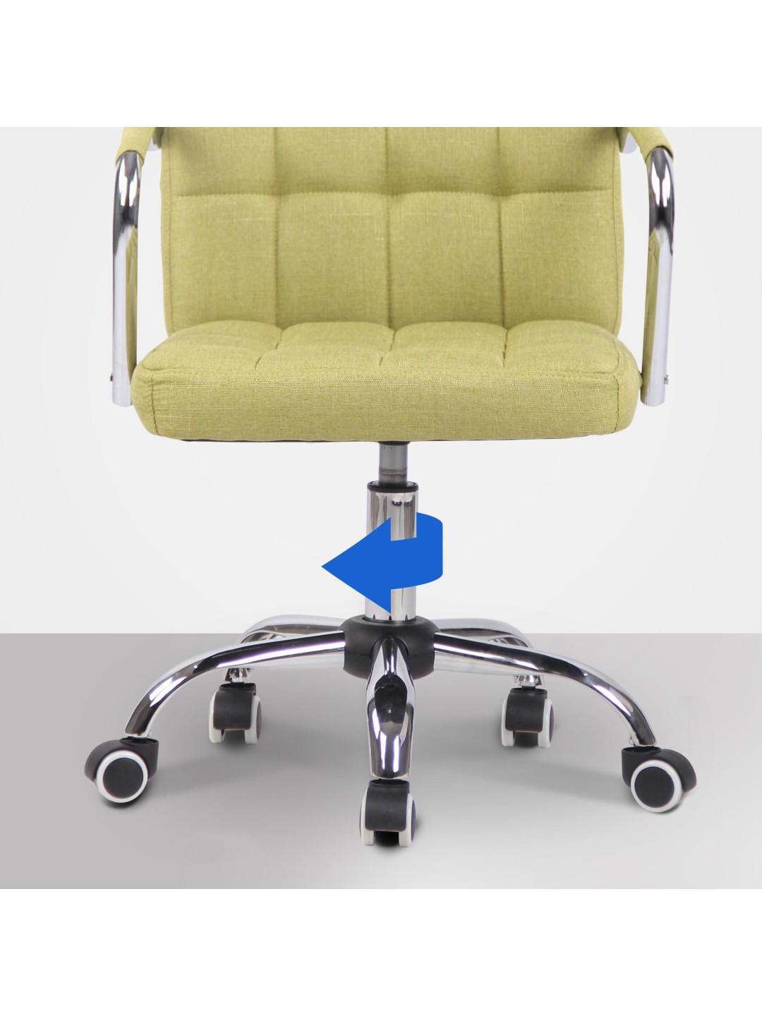 La silla giratoria se apoya de forma segura sobre una estructura de metal con aspecto cromado. Las cinco ruedas de marcha suave permiten un fácil movimiento y la silla de escritorio puede soportar con seguridad hasta 120 kilogramos.