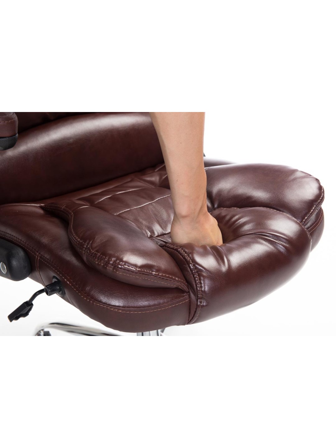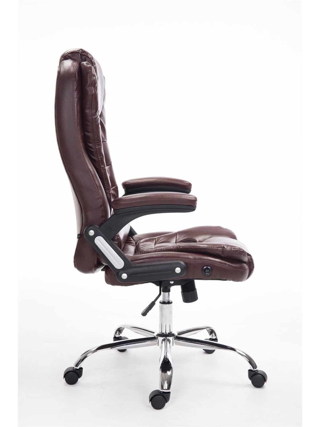 La silla ejecutiva Thor es una silla de oficina exclusiva con tapizado y funda de piel sintética de muy alta calidad. Las fundas de cuero artificial tienen la ventaja de que son elásticas y se estiran suavemente cuando se alivia la carga. Esto no sólo tiene un aspecto más bonito, sino que también aumenta la vida útil de la funda del asiento. La estructura es de metal con aspecto cromado y, por lo tanto, es muy estable. Gracias a la altura ajustable del asiento se garantiza un asiento ergonómico. La altura del asiento se puede ajustar de forma continua mediante la palanca situada debajo del asiento. El mecanismo basculante incorporado garantiza una mayor libertad de movimiento. La silla de oficina se apoya de forma segura sobre cinco ruedas de funcionamiento suave. No importa si se trata de suelos duros o de moqueta, siempre podrás rodar con facilidad y soltura por el suelo.