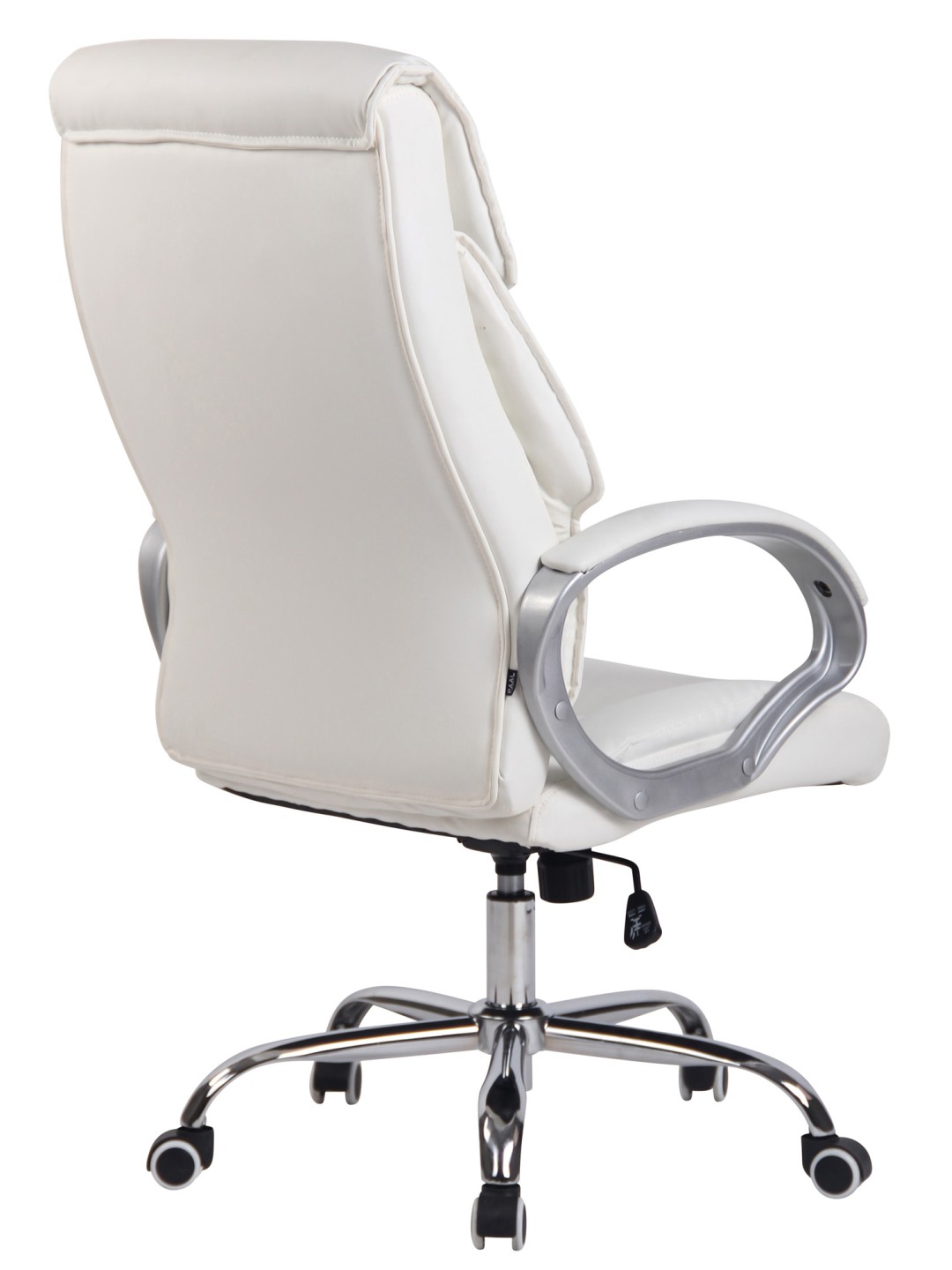 La silla ejecutiva Torro es una silla de oficina de altísima calidad con un acolchado de muy alta calidad y un tapizado de piel sintética. Las fundas de cuero artificial tienen la ventaja de que son elásticas y se estiran suavemente cuando se alivia la carga. Esto no sólo tiene un aspecto más bonito, sino que también aumenta la vida útil de la funda del asiento. Las fundas de piel sintética también son transpirables, lo que supone una ventaja, especialmente a altas temperaturas. La estructura es de metal con aspecto cromado y es muy estable. La altura del asiento es infinitamente ajustable. La silla tiene un mecanismo basculante incorporado para una mayor libertad de movimientos. La silla de oficina tiene 5 ruedas muy robustas y de marcha suave. No importa si se trata de suelos duros o alfombrados, siempre podrá rodar con facilidad y soltura por el suelo.