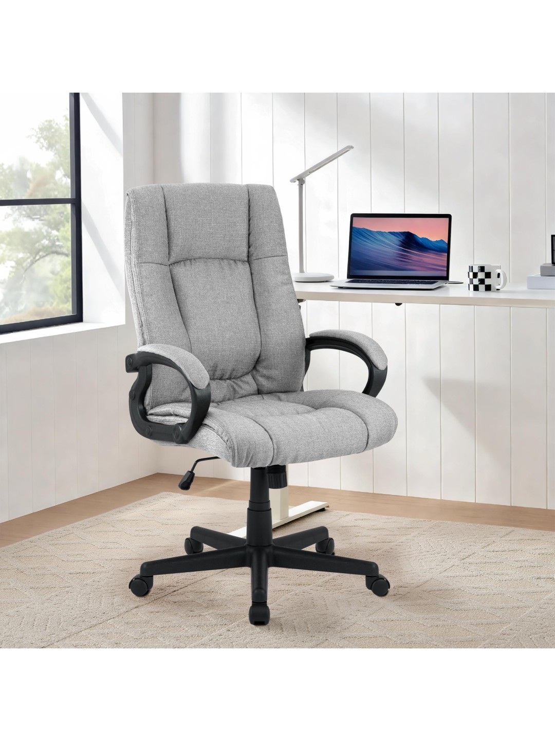 La resistente funda de tela no sólo es fácil de cuidar, sino que también le da a la silla giratoria un aspecto elegante. Los reposabrazos acolchados y la cómoda zona para la cabeza proporcionan comodidad adicional. Las silenciosas ruedas se deslizan suavemente sobre todo tipo de suelos, sin rayones ni ruidos. Esto mantiene su lugar de trabajo tranquilo y su suelo protegido.
