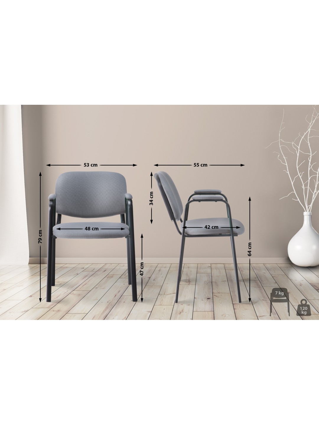 El asiento acolchado, el respaldo y los cómodos reposabrazos, cubiertos con tela de fácil cuidado, ofrecen una experiencia de asiento cómoda y duradera. Gracias a la estructura de cuatro patas de metal negro mate, la silla es estable y estable, con una capacidad de carga máxima de 120 kg.