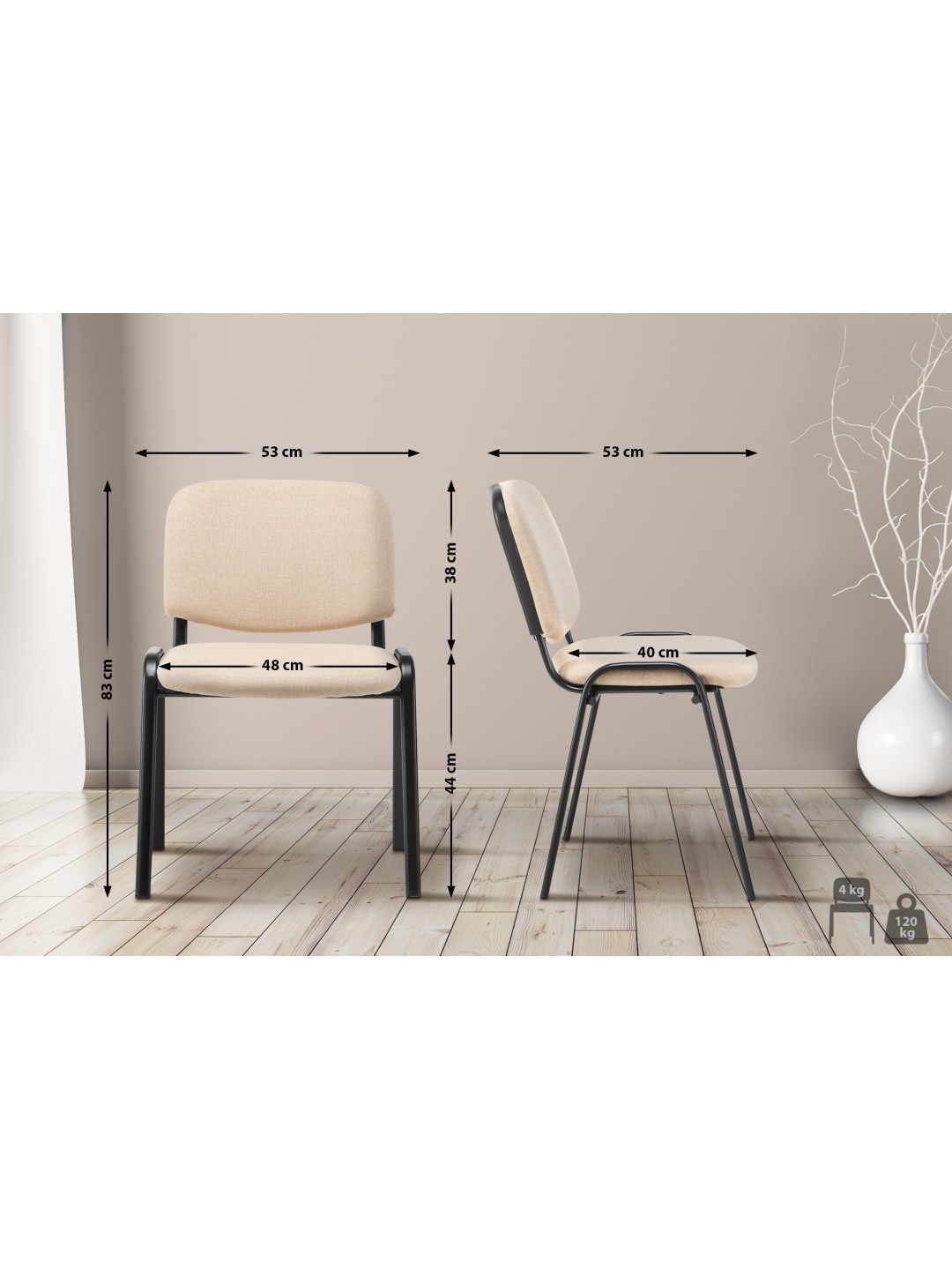 El asiento y el respaldo acolchados, cubiertos con tela duradera, ofrecen una experiencia de asiento cómoda y duradera. Gracias a la estructura de metal negro de cuatro patas, la silla es estable y estable, con una capacidad de carga máxima de 120 kg. Se pueden apilar hasta cuatro sillas cada una para poder guardarlas y utilizarlas de forma flexible y ahorrando espacio. Los protectores de suelo de plástico evitan que los suelos delicados se dañen.
