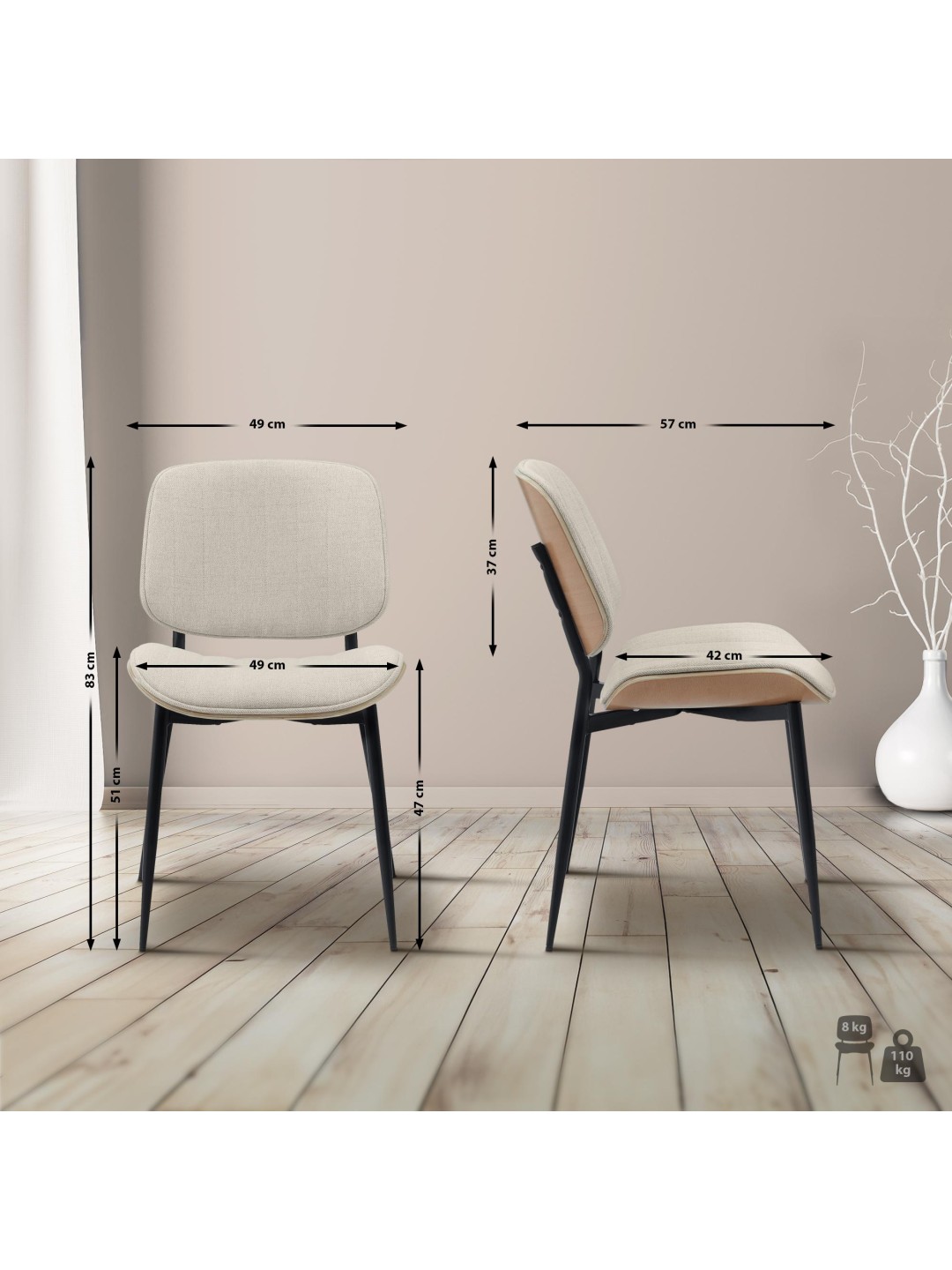 La silla de cocina tiene un cómodo acolchado en el asiento y el respaldo, que permite sentarse cómodamente incluso durante un período de tiempo más largo. El tapizado está disponible con una resistente funda de tela o con una funda de piel sintética de fácil cuidado.