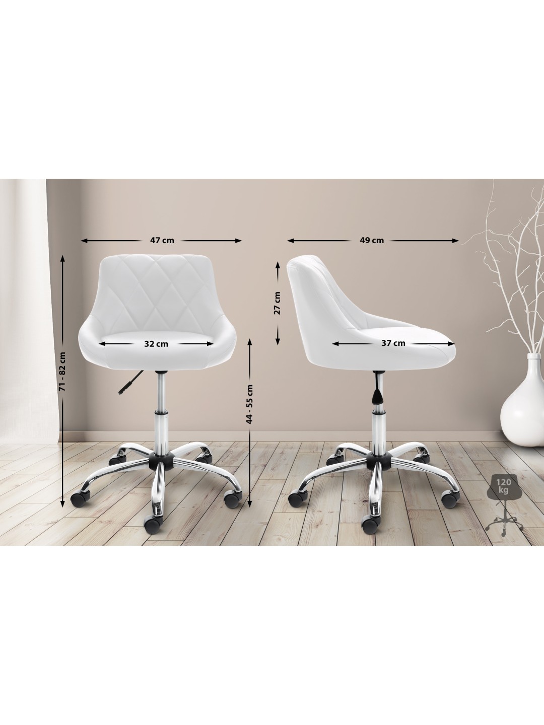 El taburete de trabajo es un asiento cómodo, ideal para consultorios médicos, salones de masajes y cosméticos. El asiento tapizado está disponible con tapizado de piel sintética o de tela y está especialmente acolchado, mientras que el respaldo proporciona un confort adicional. La silla giratoria se puede ajustar en altura mediante un elevador de gas y se puede girar 360°. Se sostiene de forma segura sobre cinco ruedas de marcha suave y una estructura de metal con aspecto cromado. No importa si se trata de suelos duros o de moqueta, siempre puedes rodar fácil y libremente por el suelo. Diseño sencillo y elegante y materiales robustos que demuestran su eficacia en la vida cotidiana.