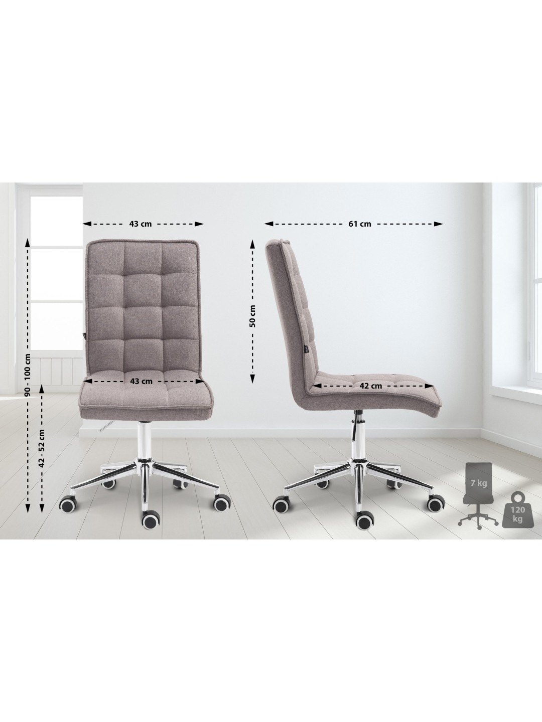La silla de trabajo puede girar sobre su propio eje y es regulable en altura, de modo que la altura del asiento se puede ajustar entre 42 y 52 cm. Esto significa que la silla giratoria se puede utilizar de diversas maneras en diferentes mesas y para diferentes propósitos.