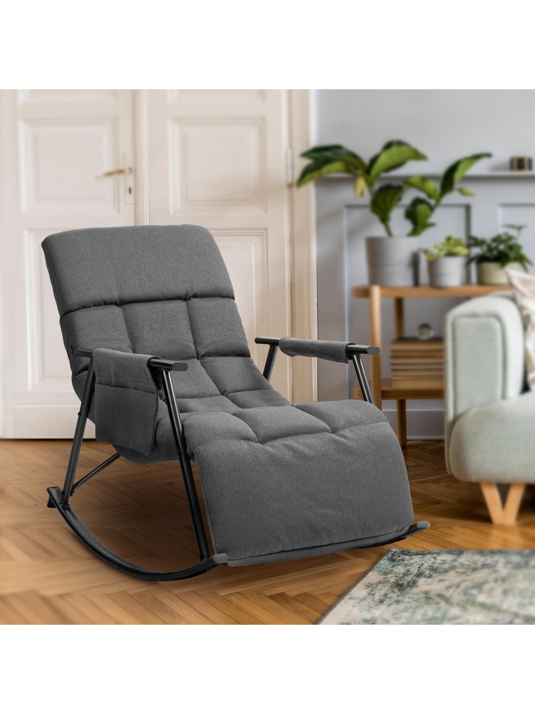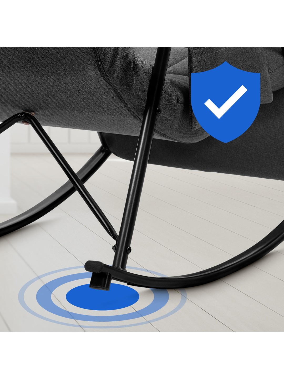 La tapicería con un moderno patrón acolchado está disponible con funda de tela o de terciopelo. La estructura de metal con recubrimiento en polvo contribuye a su aspecto moderno pero también a su gran estabilidad. La mecedora se puede cargar de forma segura con hasta 125 kilogramos.