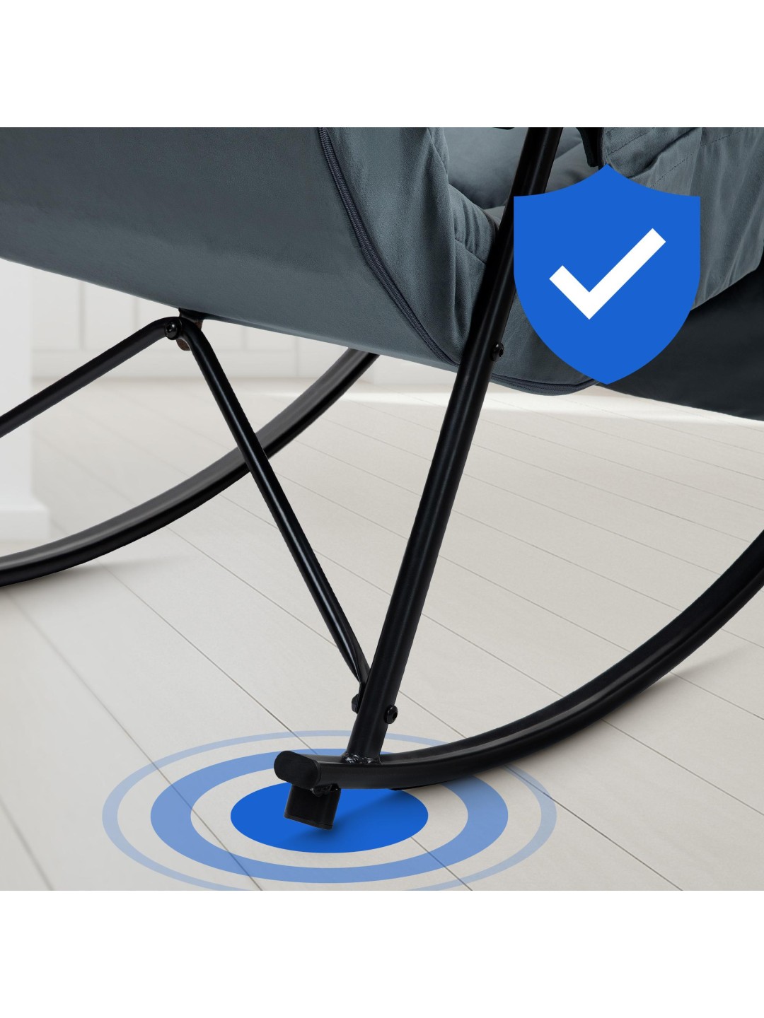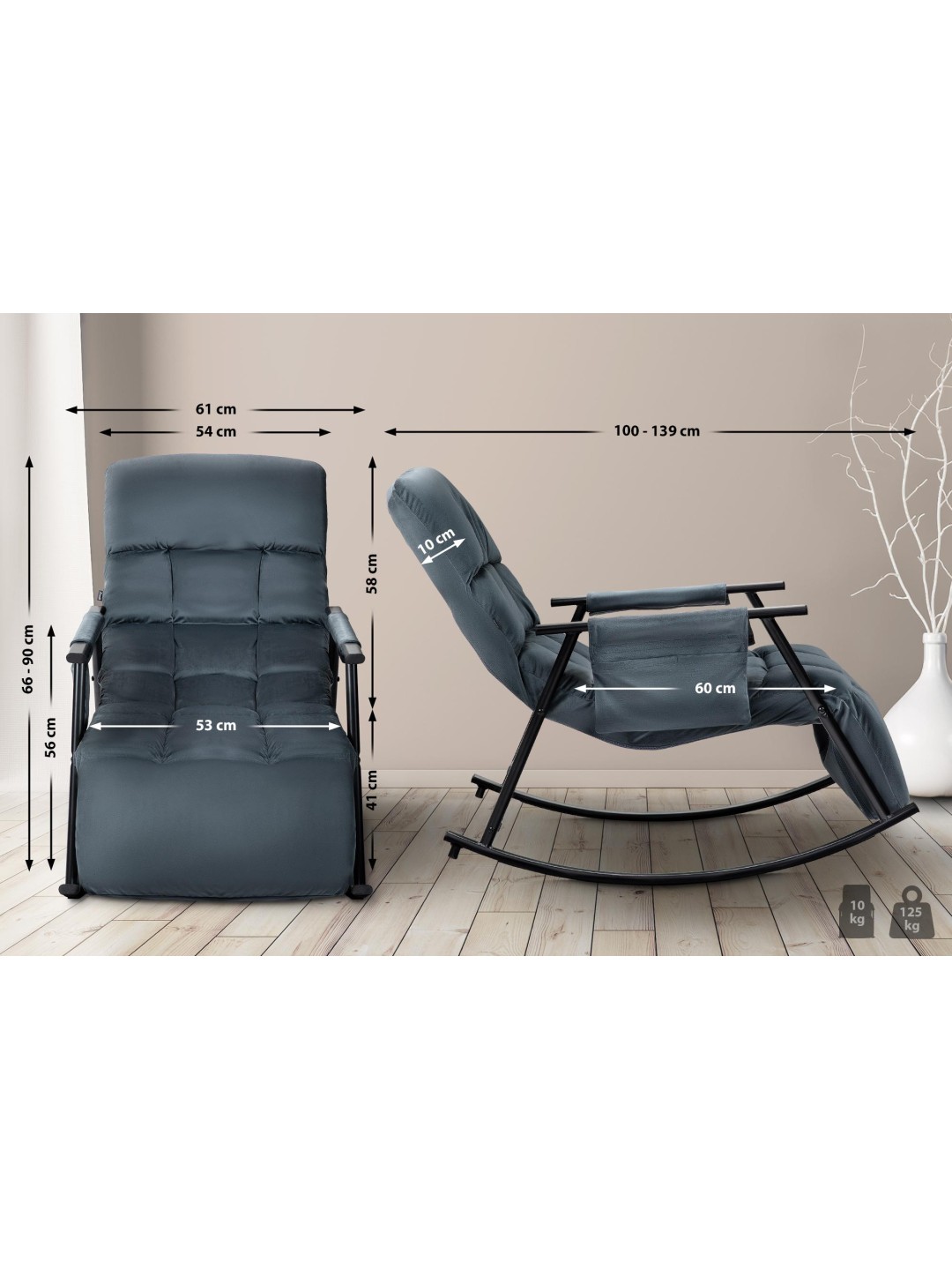 La tapicería con un moderno patrón acolchado está disponible con funda de tela o de terciopelo. La estructura de metal con recubrimiento en polvo contribuye a su aspecto moderno pero también a su gran estabilidad. La mecedora se puede cargar de forma segura con hasta 125 kilogramos.