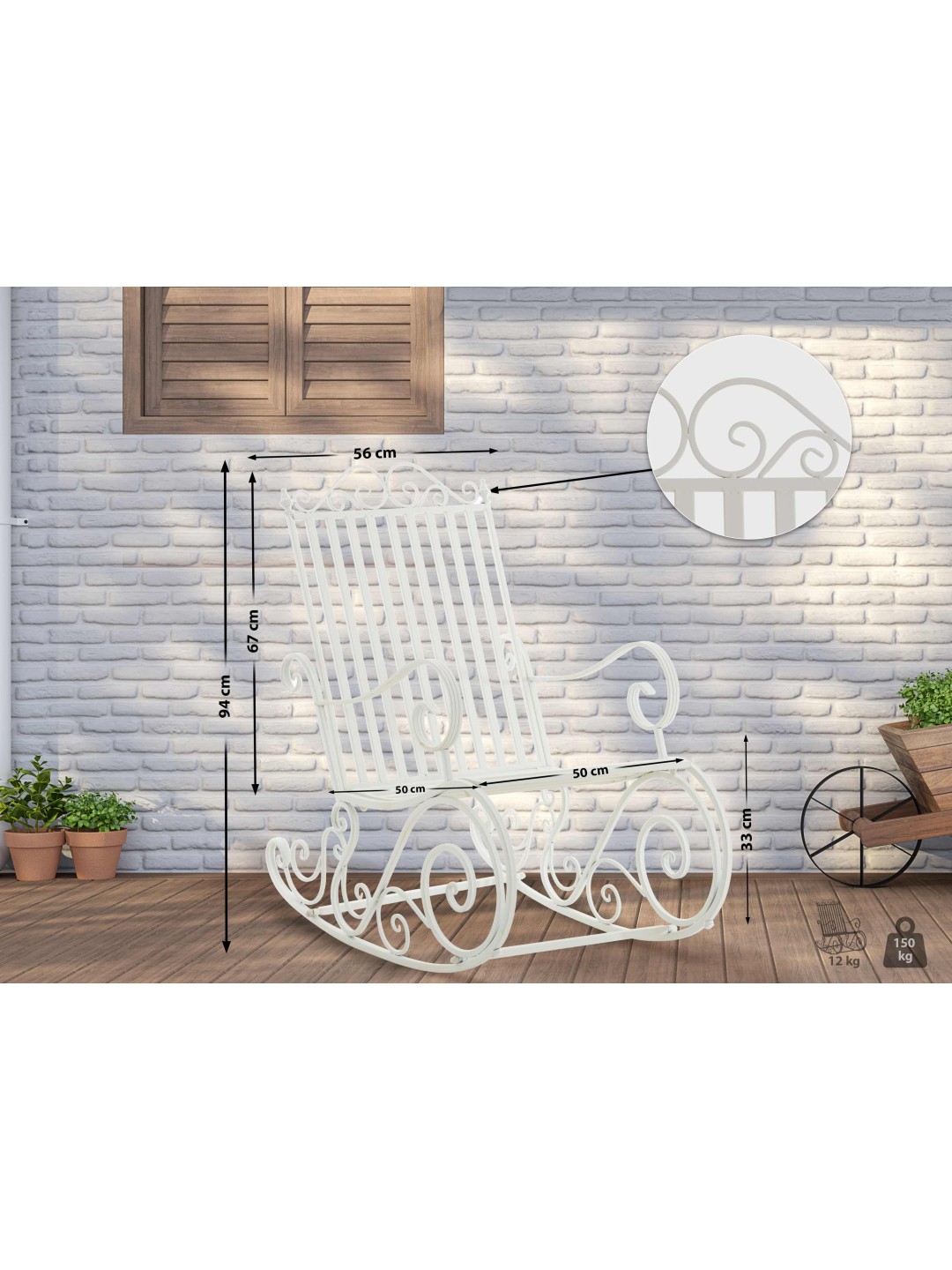 El sillón relax se puede utilizar en la terraza, en el jardín o incluso en el interior. La mecedora está fabricada en hierro pintado. La silla de hierro es fácil de cuidar y se puede limpiar con un paño húmedo y un detergente suave. La superficie de la silla de jardín está rematada con una hermosa pátina, a juego con las hermosas decoraciones. La silla de jardín debe protegerse de las influencias climáticas directas.