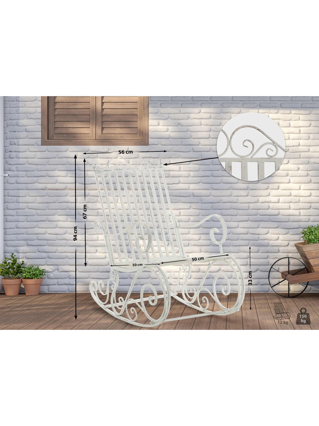 El sillón relax se puede utilizar en la terraza, en el jardín o incluso en el interior. La mecedora está fabricada en hierro pintado. La silla de hierro es fácil de cuidar y se puede limpiar con un paño húmedo y un detergente suave. La superficie de la silla de jardín está rematada con una hermosa pátina, a juego con las hermosas decoraciones. La silla de jardín debe protegerse de las influencias climáticas directas.