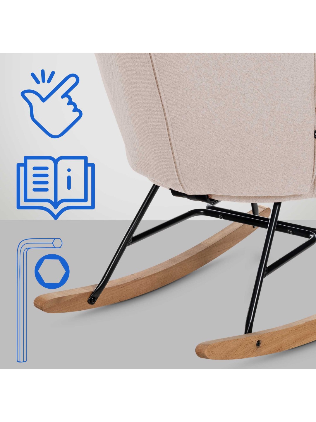 La mecedora Sanka es un asiento cómodo, sólido y al mismo tiempo elegante para el uso diario. Este moderno mueble encaja perfectamente en casi cualquier ambiente de salón. La cómoda carcasa del asiento acolchada con funda de tela promete un agradable confort al sentarse. Los botones del cojín del respaldo añaden un toque moderno. Las elegantes guías de madera de haya están atornilladas a una estructura de metal lacada en negro de alta calidad, lo que confiere a la silla su gran estabilidad. ¡Un hermoso mueble completo que disfrutarás durante mucho tiempo!