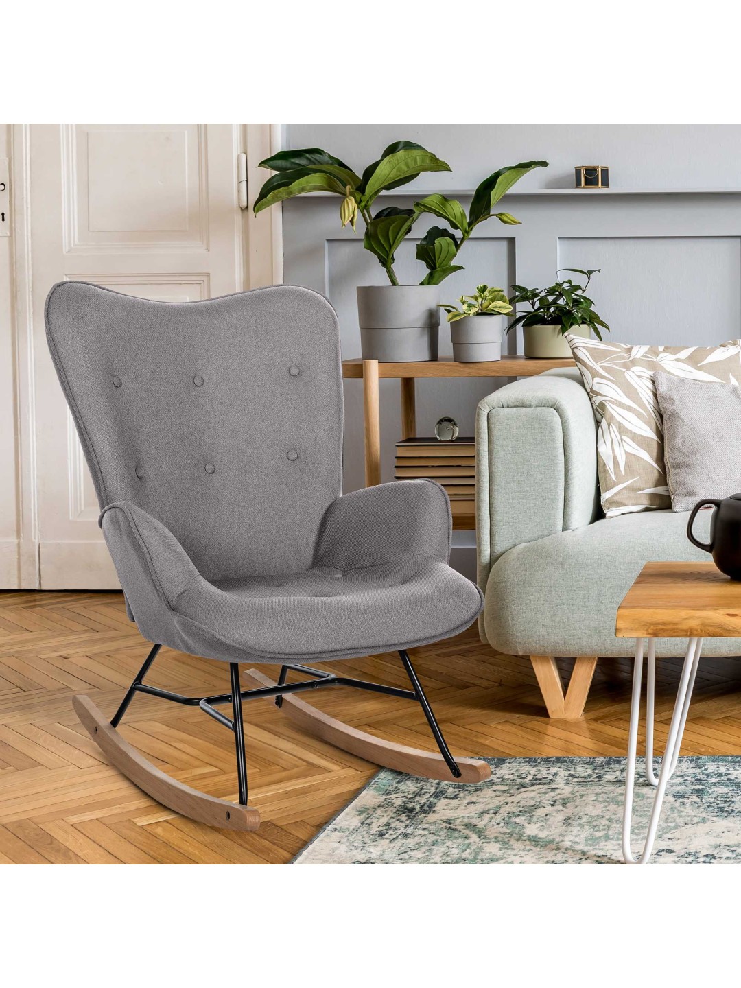 La mecedora Sanka es un asiento cómodo, sólido y al mismo tiempo elegante para el uso diario. Este moderno mueble encaja perfectamente en casi cualquier ambiente de salón. La cómoda carcasa del asiento acolchada con funda de tela promete un agradable confort al sentarse. Los botones del cojín del respaldo añaden un toque moderno. Las elegantes guías de madera de haya están atornilladas a una estructura de metal lacada en negro de alta calidad, lo que confiere a la silla su gran estabilidad. ¡Un hermoso mueble completo que disfrutarás durante mucho tiempo!