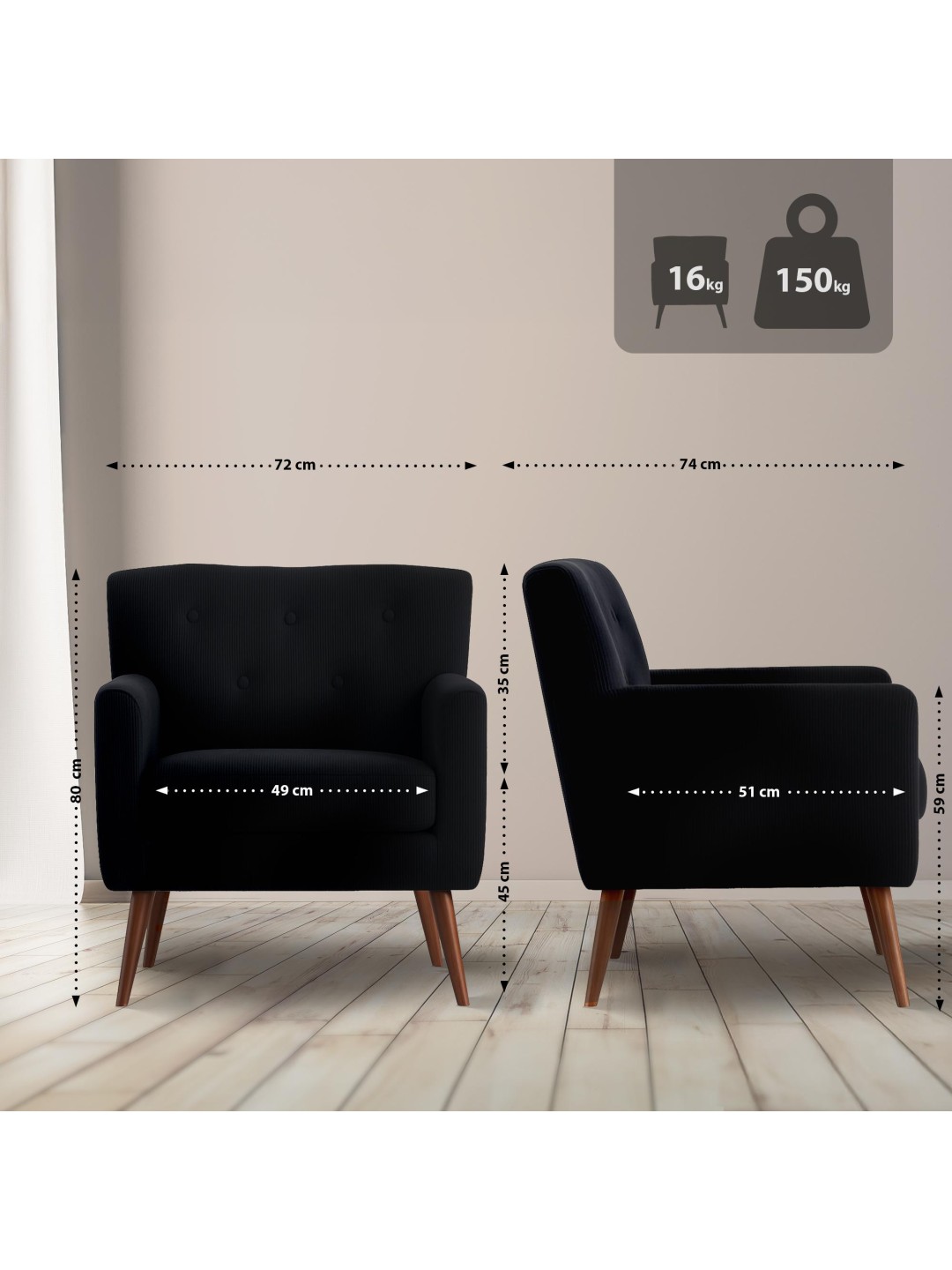 El espacioso sillón tapizado impresiona con una funda de pana duradera y elegante en colores modernos, así como con patas resistentes de madera de caucho. El respaldo, junto con el grueso acolchado, aumenta significativamente la comodidad del asiento.