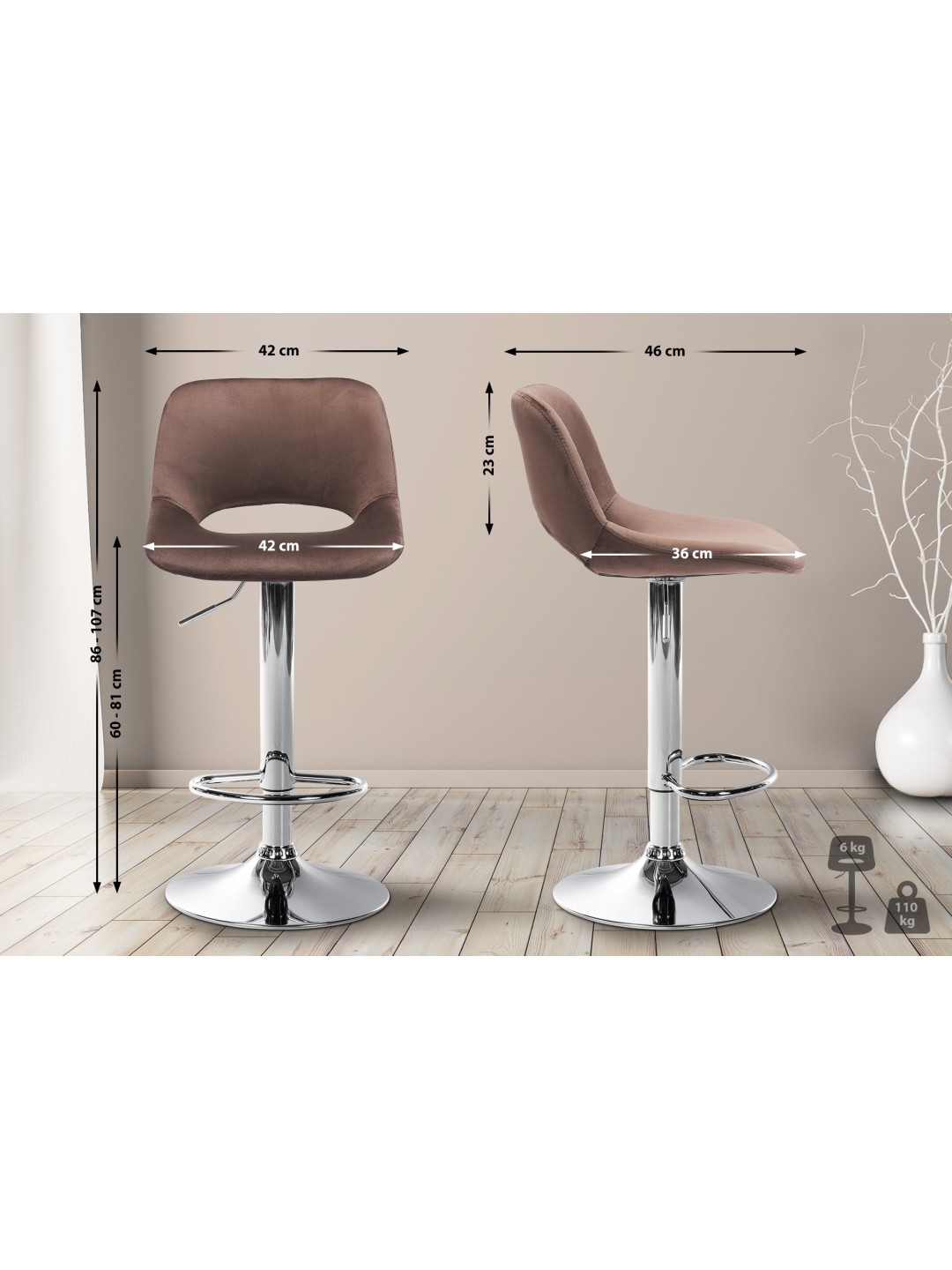 El reposapiés integrado ofrece comodidad adicional al sentarse. Por último, la silla de bar está equipada con protectores de suelo para proteger incluso las superficies sensibles.