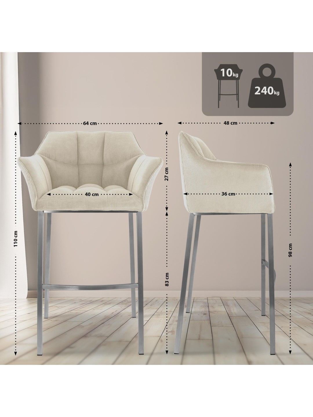 El taburete debe su hermosa apariencia a la elegante combinación de la elegante funda de pana y la estructura de metal de cuatro patas.
