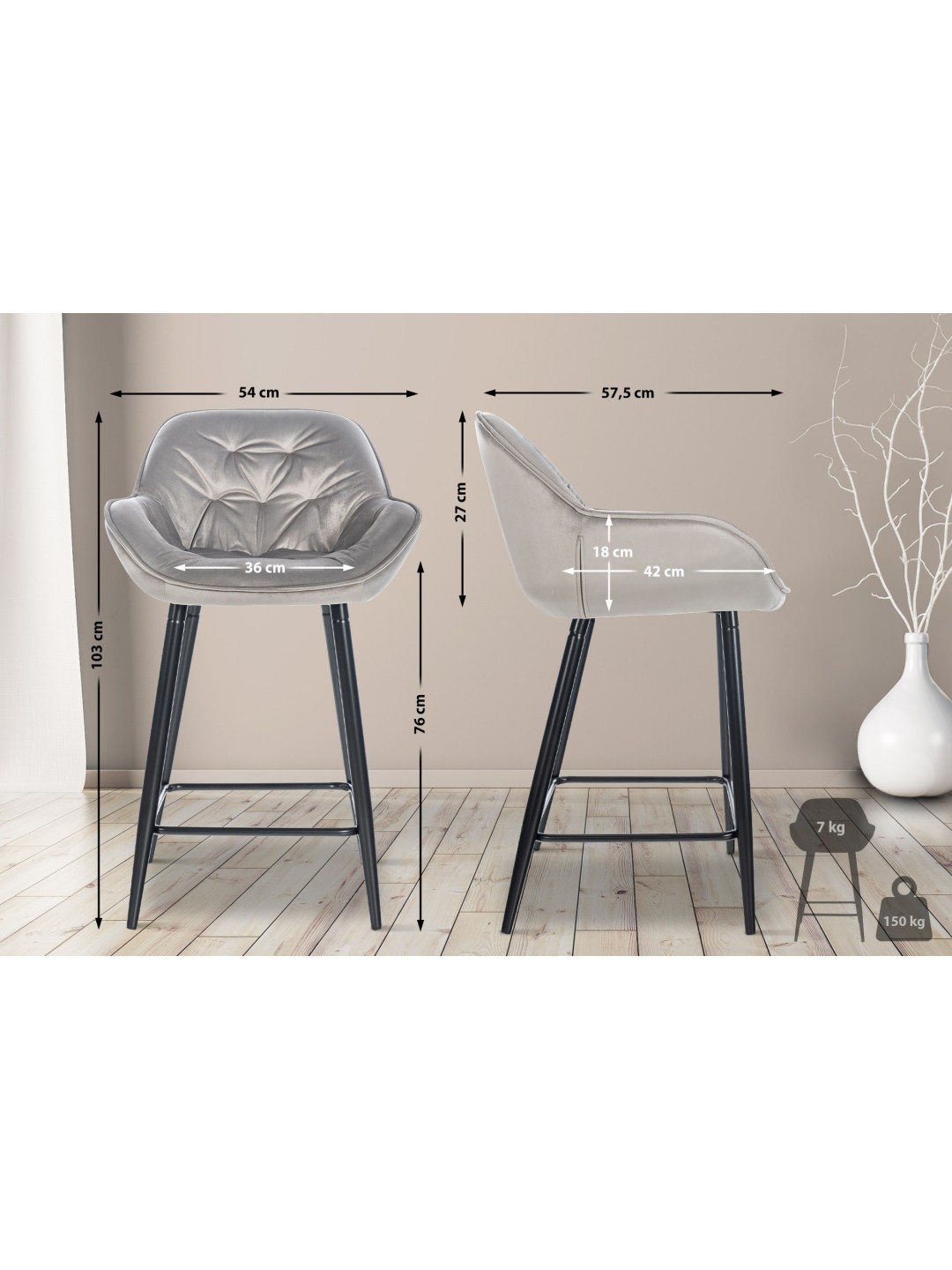 La robusta estructura de metal de cuatro patas garantiza que la silla se mantenga firme. El taburete de bar soporta hasta 150 kg de forma segura. Gracias a los protectores de suelo debajo de las patas de la silla, los suelos sensibles no se dañan.