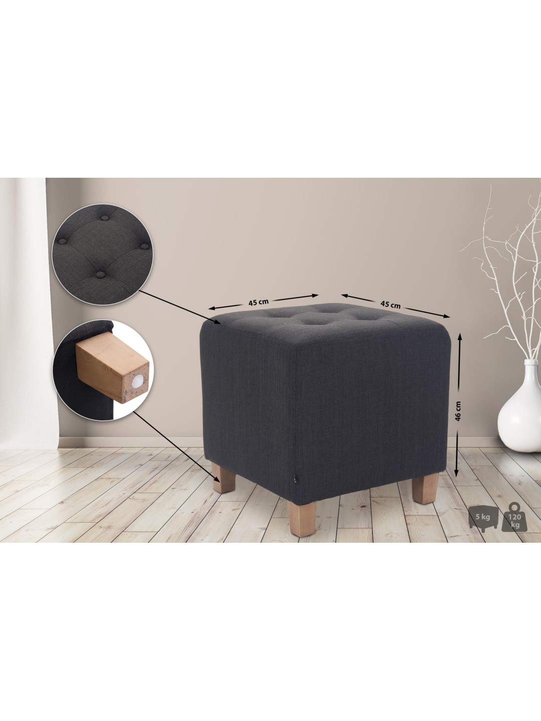 El asiento cúbico se apoya sobre patas de madera robustas y estables, de modo que el taburete se puede cargar con seguridad con hasta 120 kg. Gracias a los protectores de suelo, los suelos sensibles están protegidos.