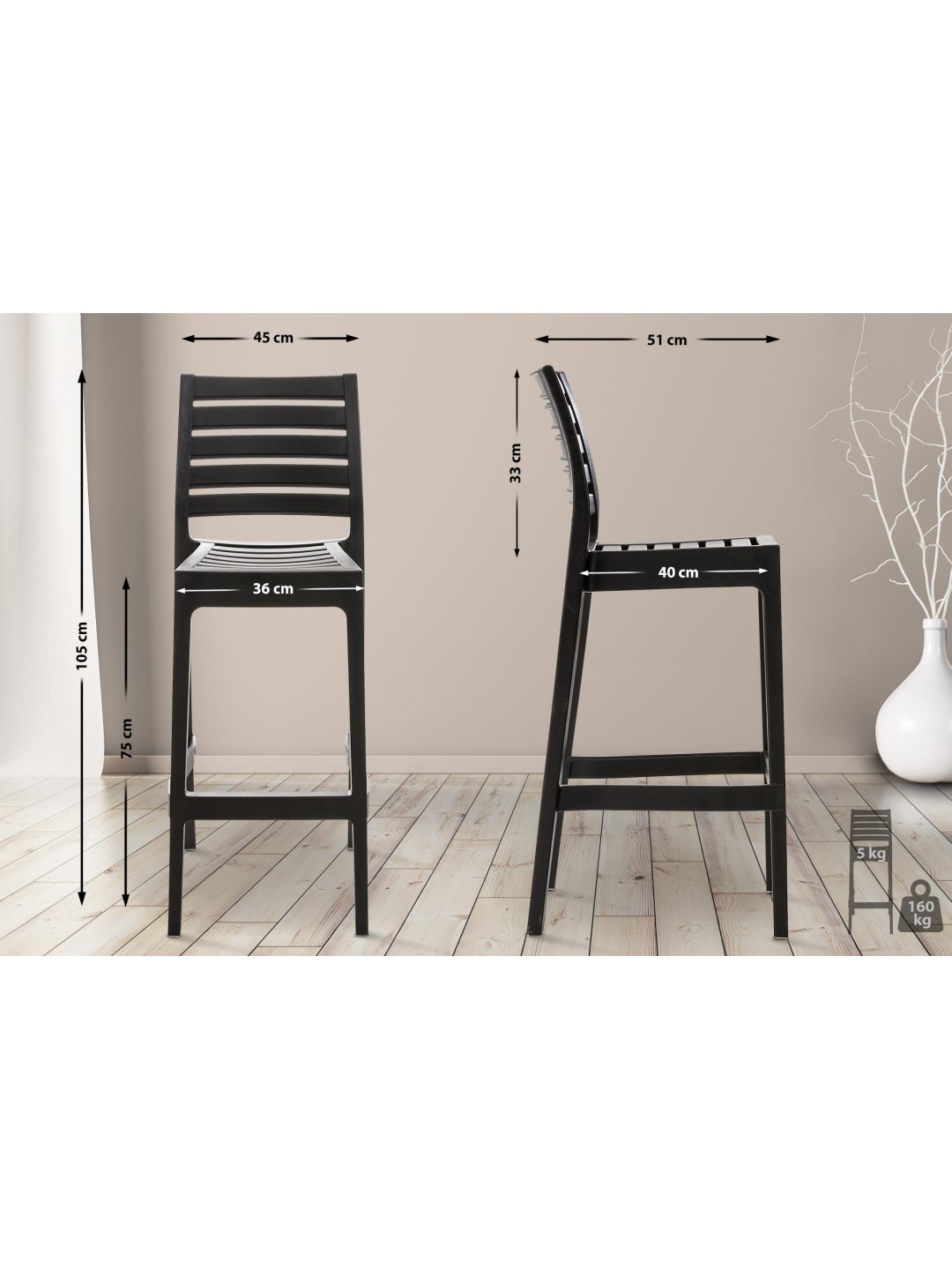 El juego de taburetes de bar Ares está fabricado en polipropileno reforzado con fibra de vidrio de alta calidad. Esto hace que estas sillas de mostrador sean resistentes a la intemperie y a los rayos UV, por lo que pueden utilizarse no sólo en interiores sino también en exteriores. Incluso la luz solar intensa y frecuente no hace que el plástico se ponga amarillo o se decolore. La profundidad del color de los taburetes de bar se conserva durante mucho tiempo. Este juego queda bien en la terraza o el balcón.