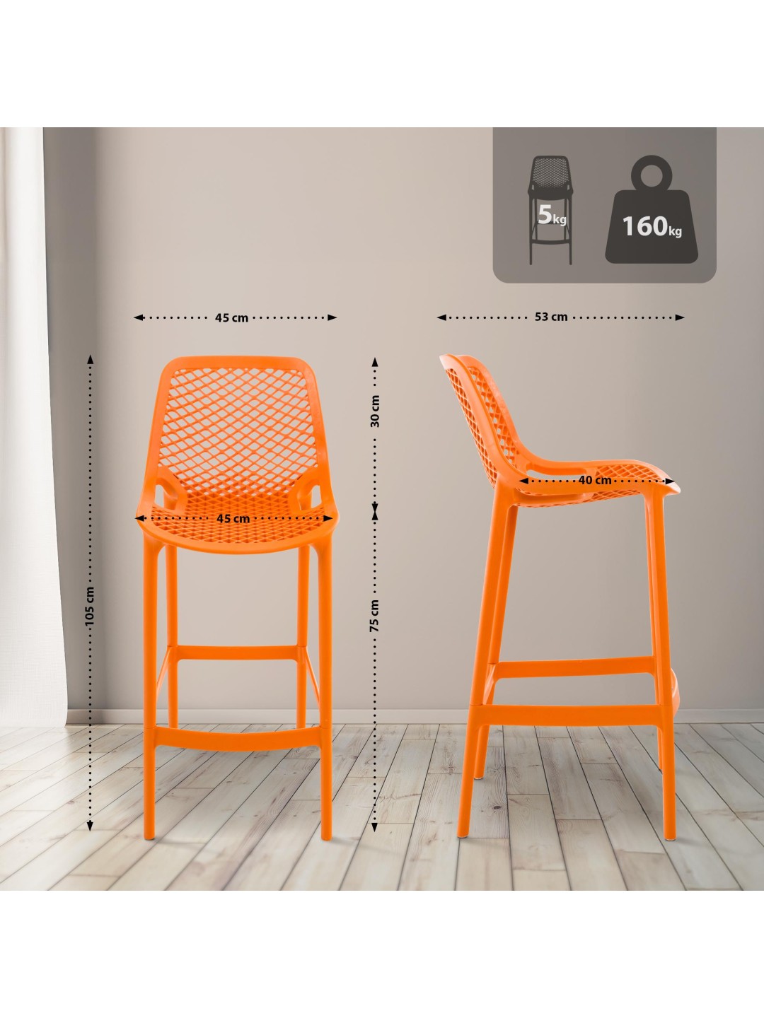 Fabricado en polipropileno de alta calidad resistente a los rayos UV, el taburete de bar Air convence por su resistencia a la intemperie. Esto significa que las sillas se pueden utilizar no sólo en interiores sino también en exteriores. Por lo tanto, las sillas también son una excelente opción como sillas de jardín, para la terraza o el balcón.
