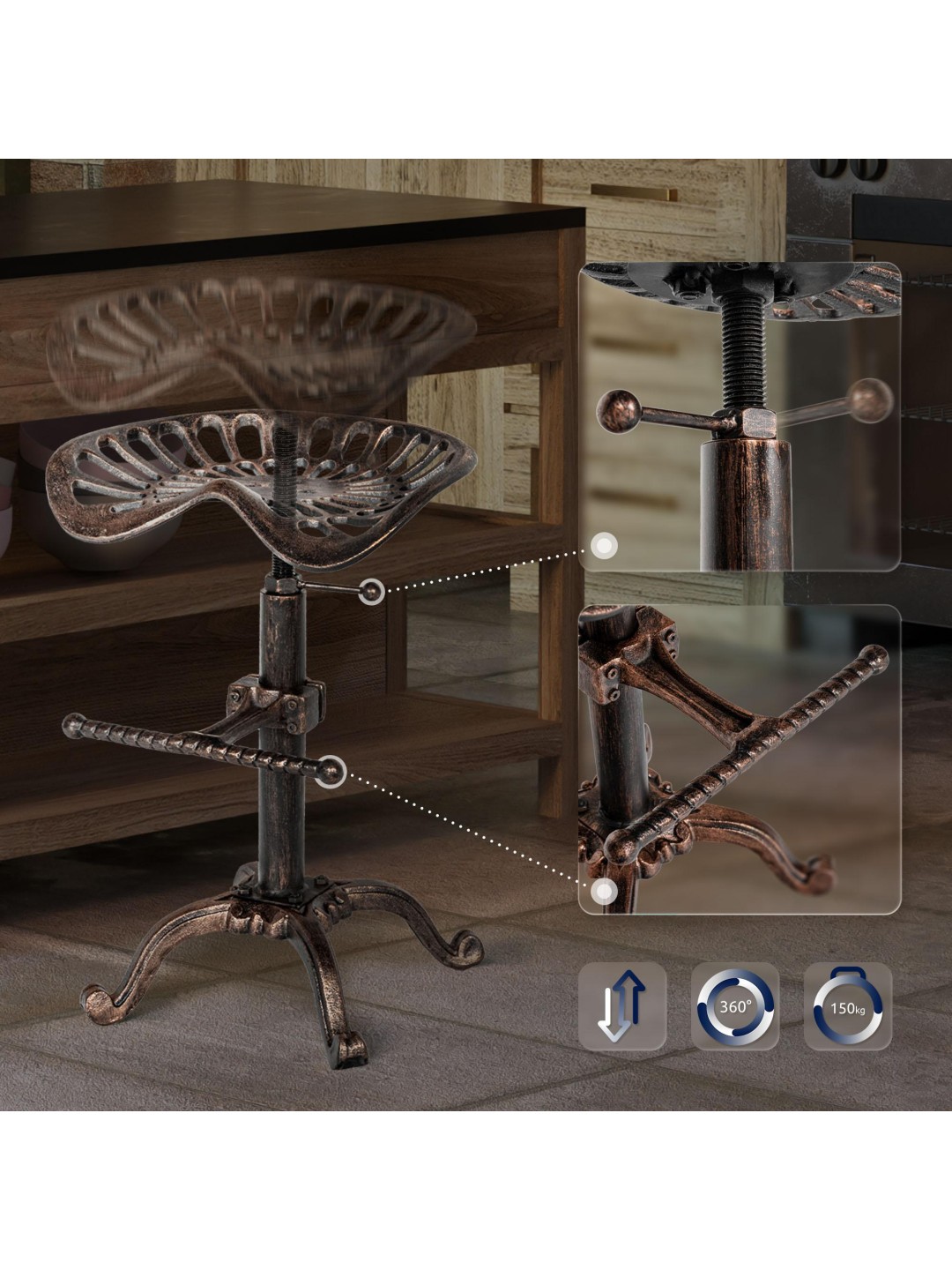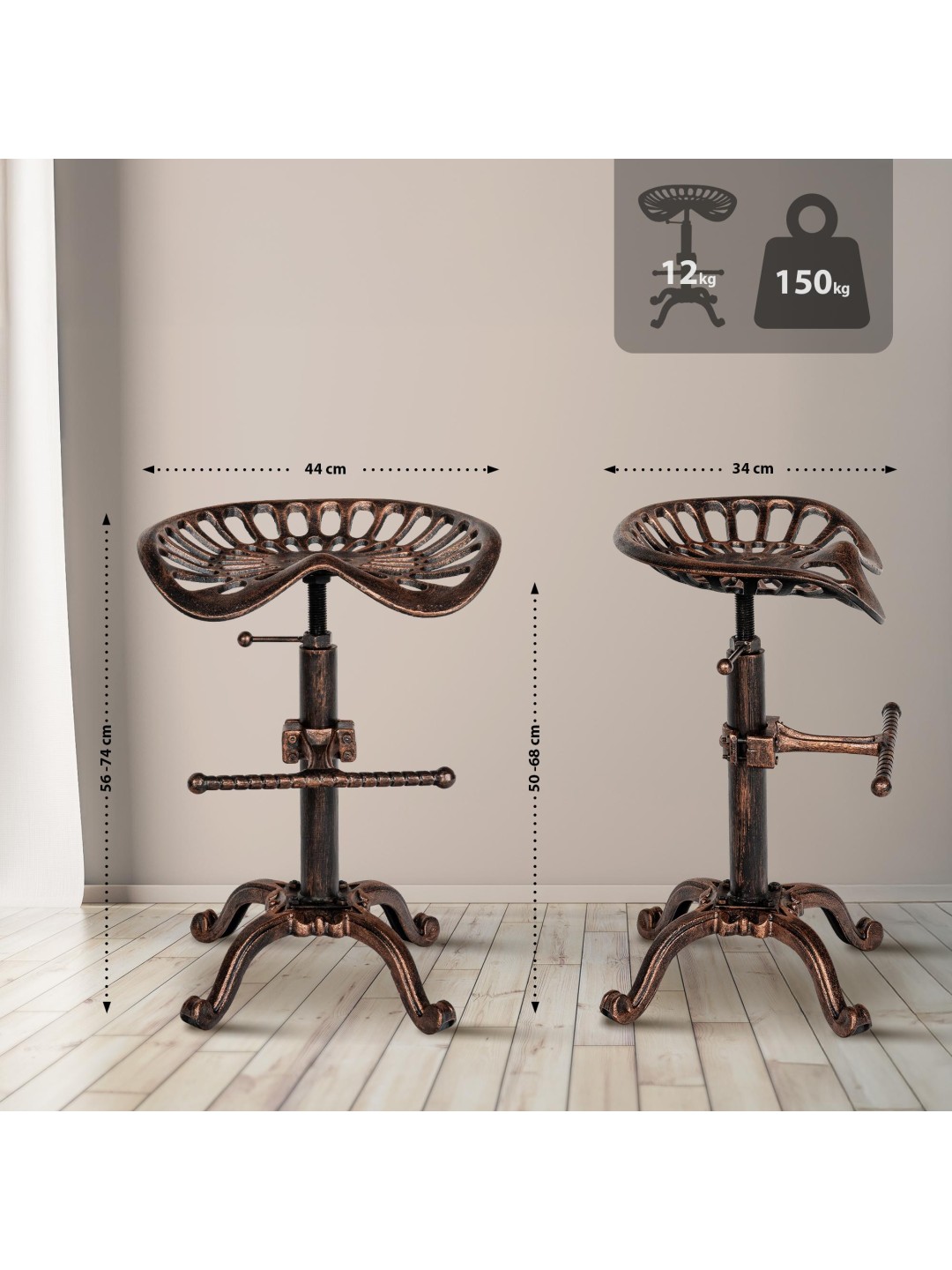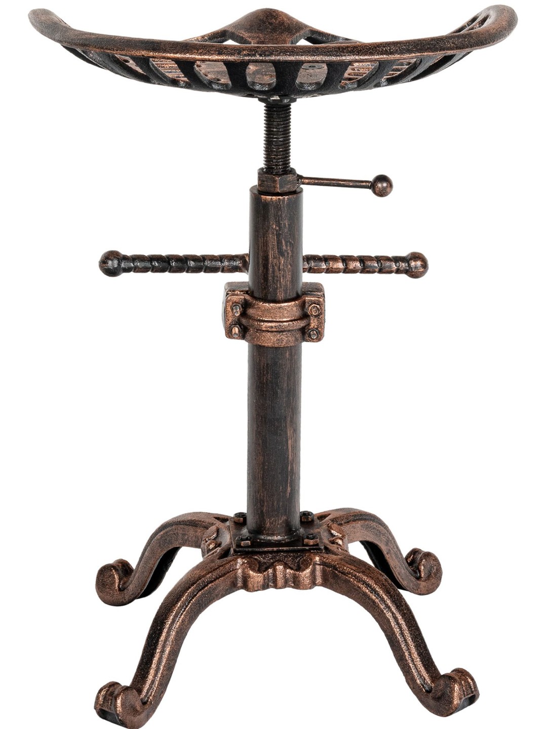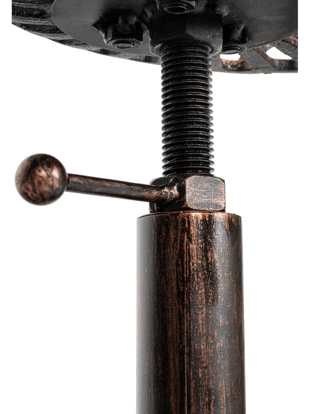 Juego de 2 taburetes de bar Butch. Aspecto extraordinario con materiales convencionales, lo que hace de este taburete un atractivo muy especial. El asiento de hierro fundido de los dos taburetes de bar ofrece el máximo confort incluso sin tapizado, ya que el asiento tiene una forma ligeramente curvada que se adapta al cuerpo. El asiento regulable en altura, que se puede ajustar mediante la manivela de bloqueo situada debajo del asiento y evita así molestos tambaleos, ofrece un asiento cómodo para cualquier estatura. Además, el cómodo reposapiés, también regulable en altura, optimiza aún más el confort al sentarse. La altura de los pies se puede ajustar individualmente mediante protectores de suelo, lo que hace que los molestos bamboleos sean cosa del pasado. La estructura decorada de metal con recubrimiento en polvo contribuye a darle al juego de taburetes un diseño único y garantiza un soporte seguro.