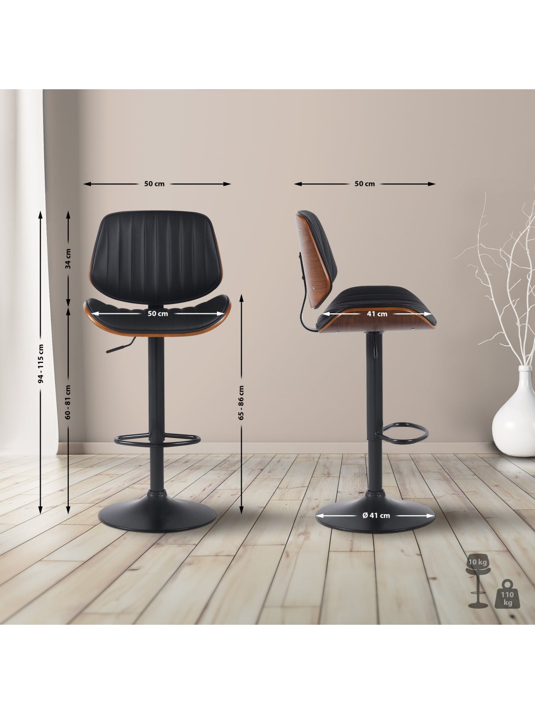 Para encontrar siempre la posición óptima para sentarse, lo ideal es el taburete de bar, que se puede ajustar fácilmente en altura y girar 360 grados. Para mayor comodidad, el taburete de bar tiene un reposapiés que apoya una posición sentada cómoda y erguida.