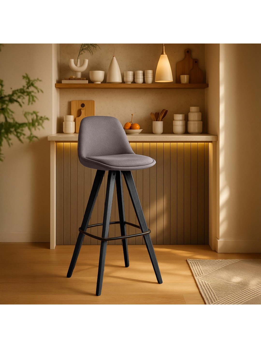 Los taburetes de bar impresionan por su diseño moderno y una estructura de madera maciza, que garantiza una capacidad de carga de hasta 120 kg por taburete. Los asientos acolchados de tela de alta calidad garantizan un confort duradero, mientras que el respaldo y el reposapiés integrado ofrecen apoyo y comodidad adicionales.