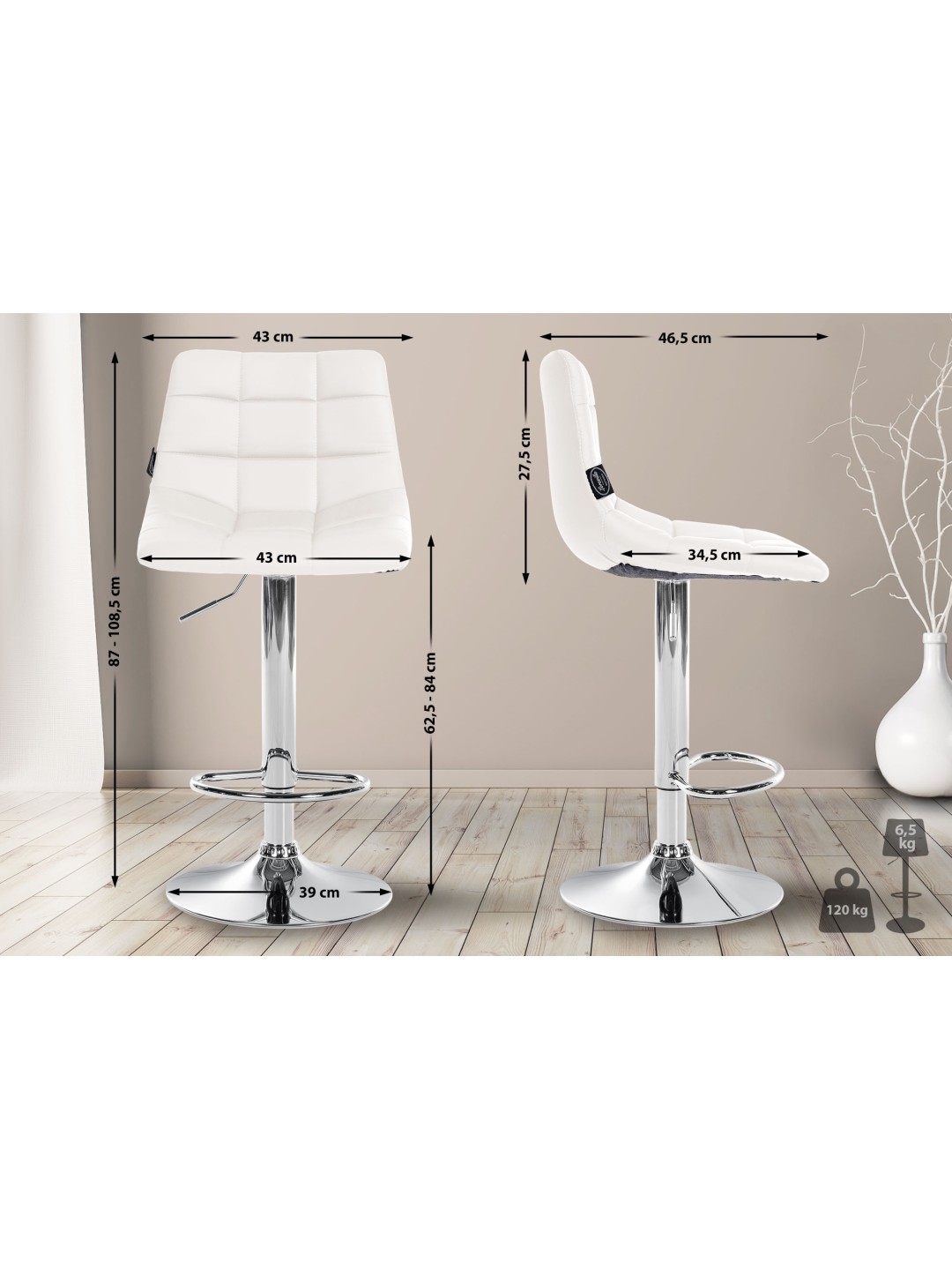 La funda del taburete está hecha de suave piel sintética y presenta un patrón acolchado clásico. La robusta estructura de metal del taburete está disponible en cromo o negro y garantiza una gran estabilidad y longevidad. El diseño minimalista y moderno del taburete encaja perfectamente en cualquier interior. El taburete de la cocina es fácil de montar y de limpiar. Para la limpieza, basta con un paño de algodón húmedo para eliminar la suciedad leve.