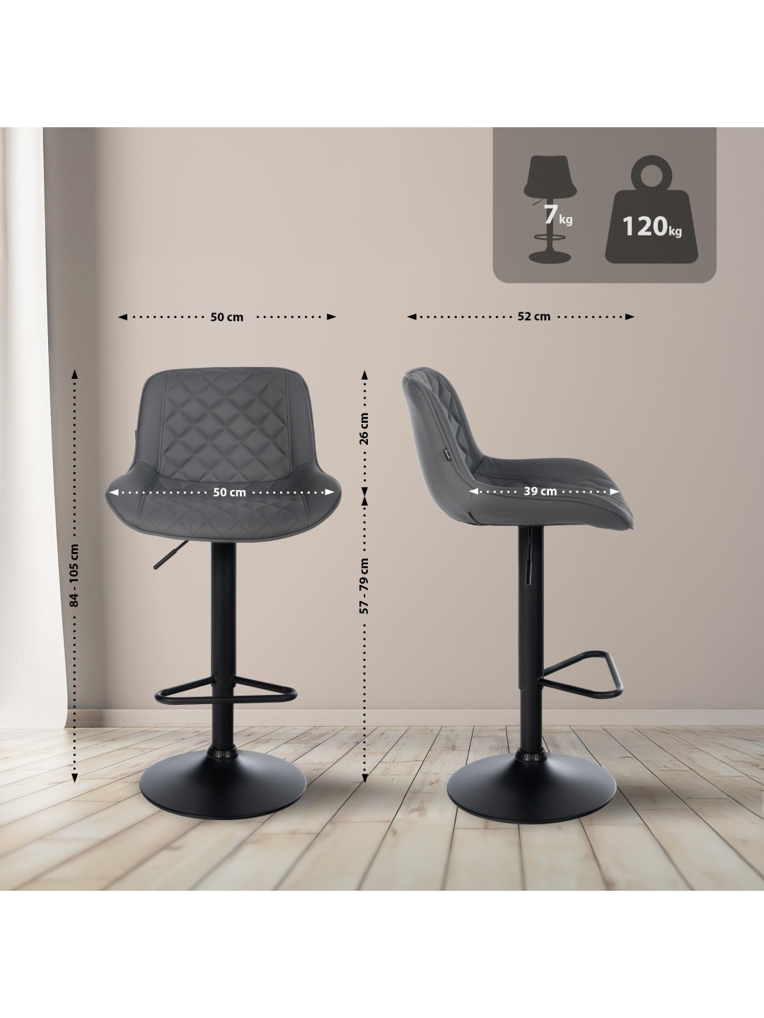 Experimenta comodidad y flexibilidad con el moderno taburete de bar Kasson, ideal para zonas de estar y comedor creativas. Este taburete combina un diseño excepcional con funciones prácticas que enriquecen tu vida diaria. Gracias a la altura regulable de 57 cm a 79 cm, puedes ajustar el taburete individualmente para garantizar la comodidad en cada situación. El reposapiés integrado y el asiento acolchado maximizan la experiencia de estar sentado y le invitan a relajarse. La rotación del taburete permite libertad de movimiento y favorece la interacción.