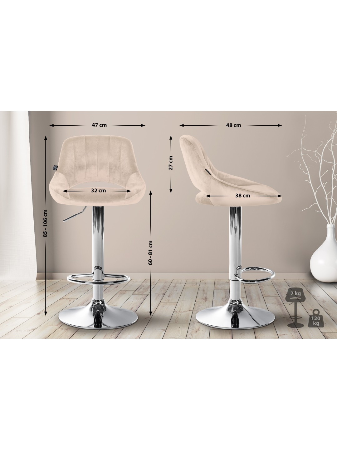 Aspecto moderno y alta calidad se pueden encontrar en el taburete de bar Milet. El asiento del taburete, agradablemente acolchado, tiene una bonita funda de terciopelo de fácil cuidado y el respaldo bajo ofrece apoyo en la zona lumbar. La capacidad de ajuste de altura de la estructura de metal le permite encontrar la altura perfecta del asiento y la función de giro de 360 grados garantiza una gran libertad de movimiento. El reposapiés integrado ofrece comodidad adicional al sentarse. Por último, la silla de bar está equipada con protectores de suelo para proteger incluso las superficies sensibles.