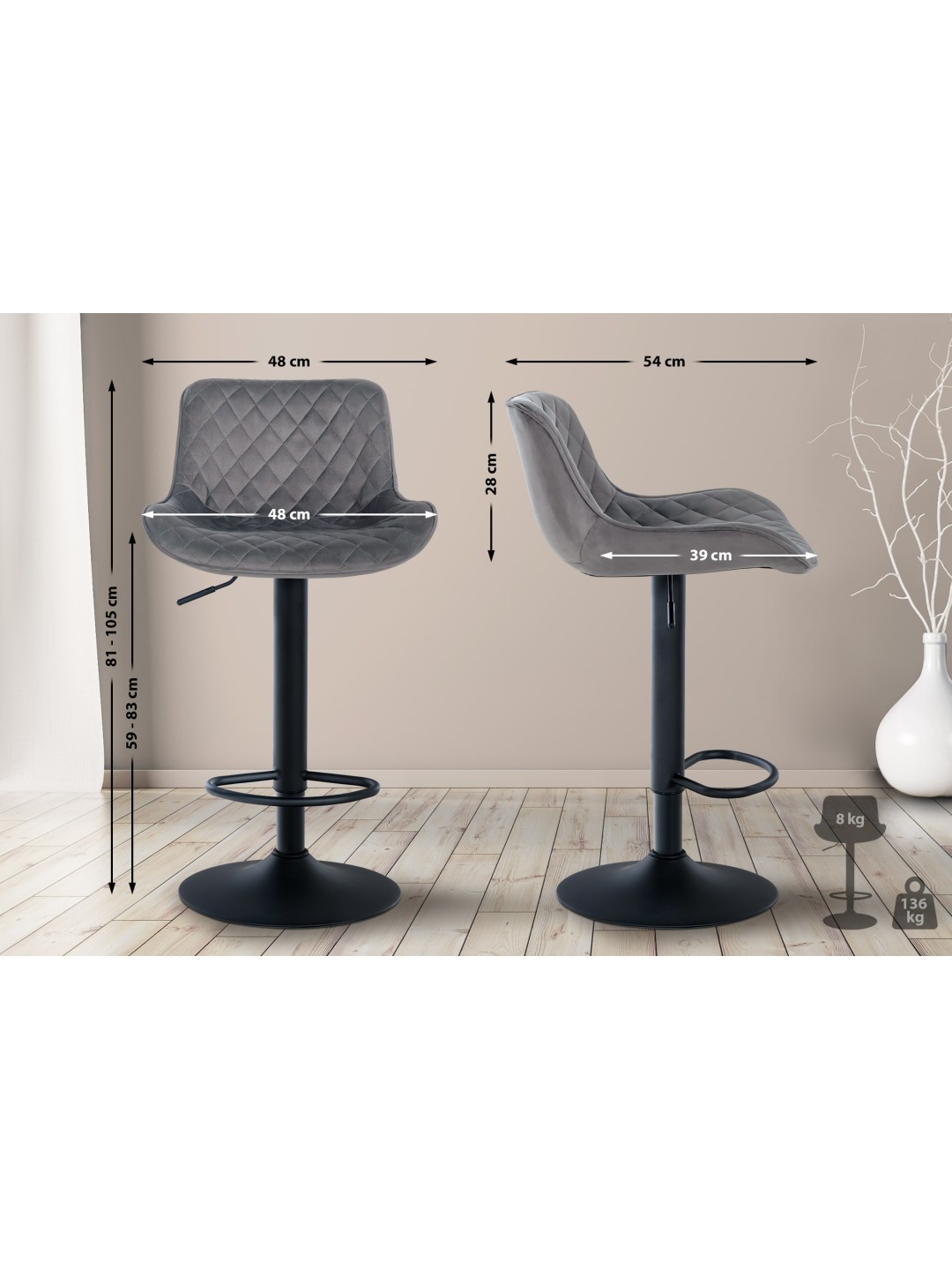 Las costuras acolchadas en los asientos y el respaldo dan a los taburetes una decoración elegante. El marco permite una rotación de 360 grados y ajuste de altura, la base estable de la trompeta garantiza un soporte seguro.