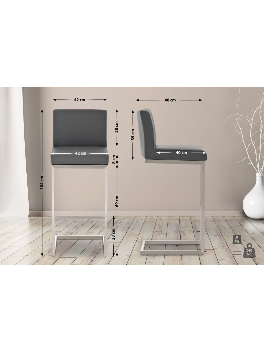 Sus estructuras voladizas rectas de acero inoxidable cepillado llaman la atención y el ligero balanceo de los asientos se percibe como muy agradable. Los travesaños integrados sirven como cómodos reposapiés, mientras que los respaldos sostienen la zona lumbar. Los asientos y respaldos están generosamente acolchados y tienen fundas duraderas de piel sintética que son fáciles de cuidar.