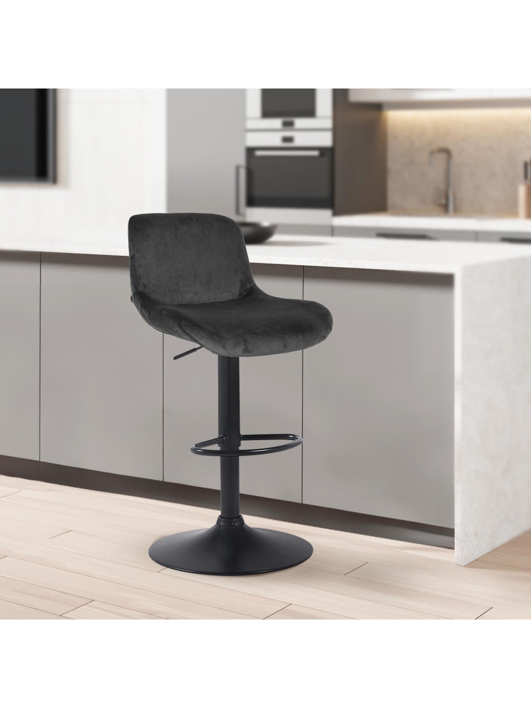 La estructura del taburete de metal negro mate y la moderna funda le dan al taburete un aspecto elegante. El asiento está tapizado con una tela duradera o con un elegante terciopelo. La estructura de metal es ajustable en altura y la función de rotación de 360 grados garantiza una gran libertad de movimiento.