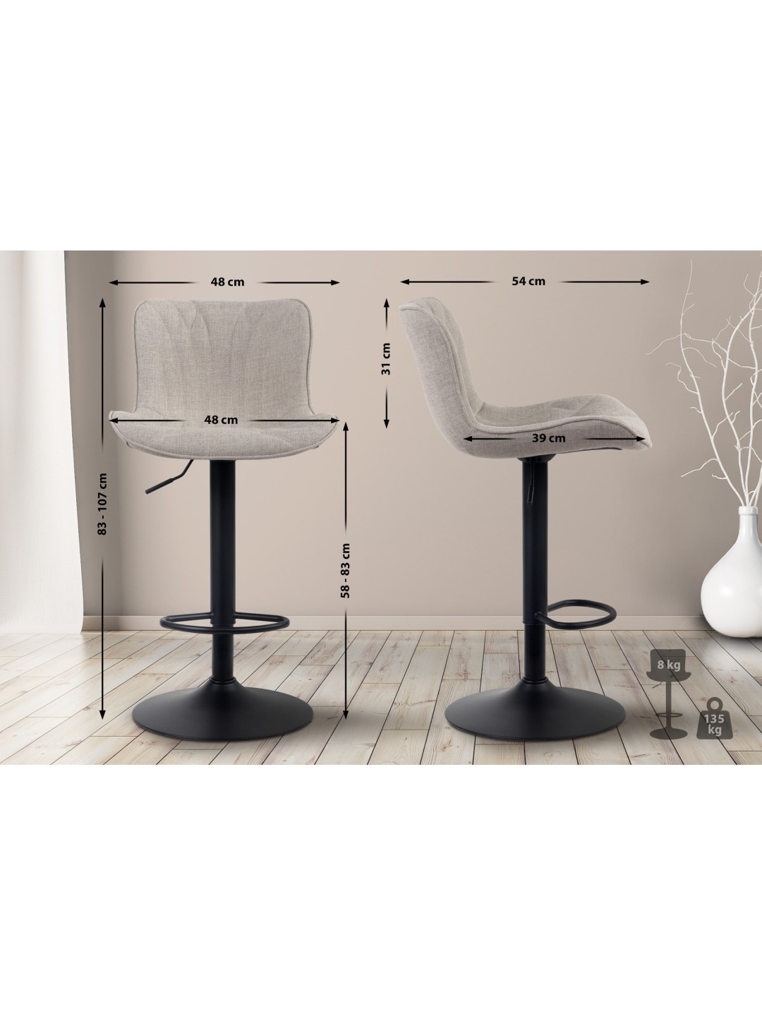 El juego de 2 taburetes de bar Linus llama la atención con su patrón acolchado vertical. En combinación con los distintos colores más neutros y la estructura de metal negro mate, estos taburetes encajan perfectamente en habitaciones modernas.