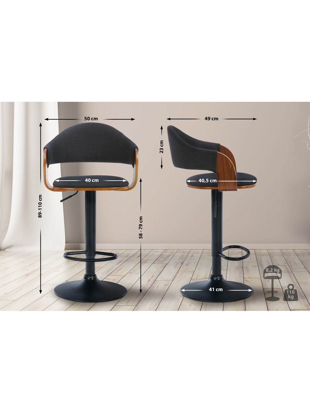 Juego de 2 taburetes de bar tela Nilse, nogal/negro
