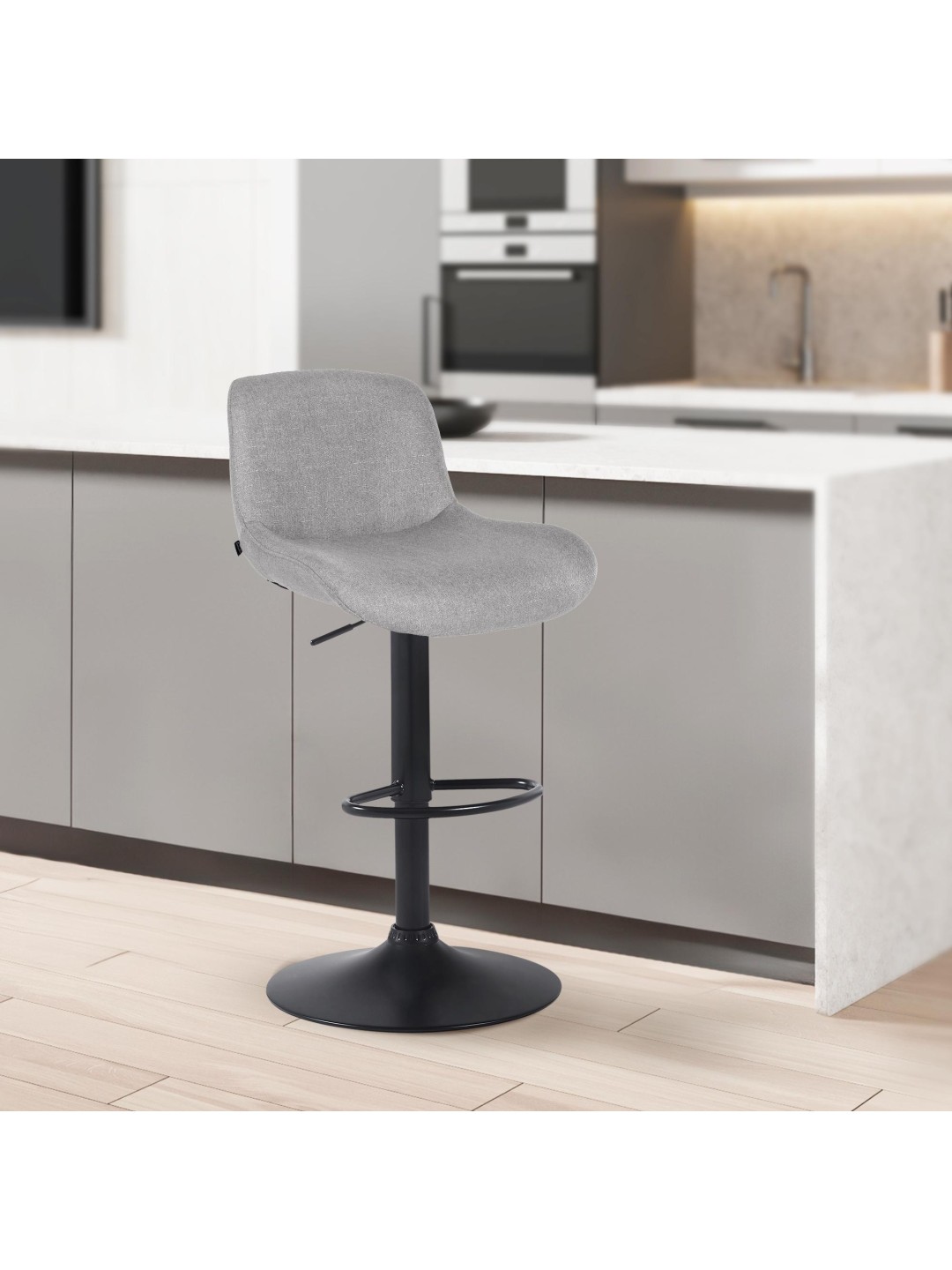 La estructura del taburete de metal negro mate y la moderna funda le dan al taburete un aspecto elegante. El asiento está tapizado con una tela duradera o con un elegante terciopelo. La estructura de metal es ajustable en altura y la función de rotación de 360 grados garantiza una gran libertad de movimiento.
