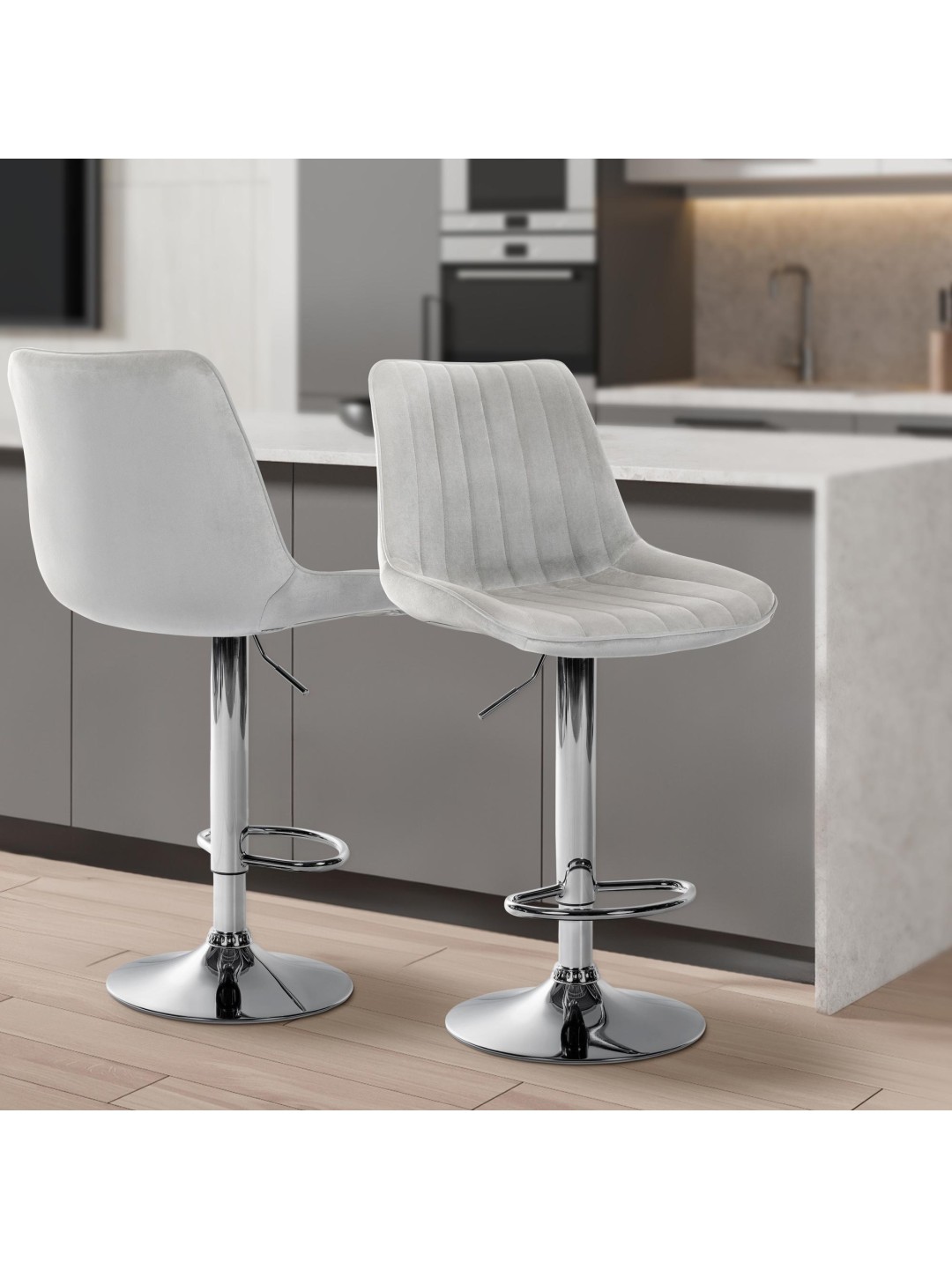 Juego de 2 taburetes de bar Toni terciopelo cromado, gris