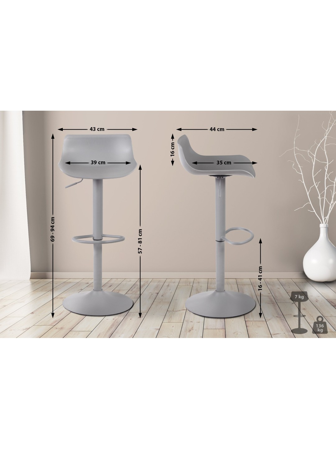Debajo de la base de la trompeta hay un protector de suelo que protege el suelo de arañazos antiestéticos. La suciedad se puede eliminar fácilmente con un paño de algodón húmedo, por lo que su cuidado es especialmente sencillo. El taburete de mostrador está disponible en blanco y negro.