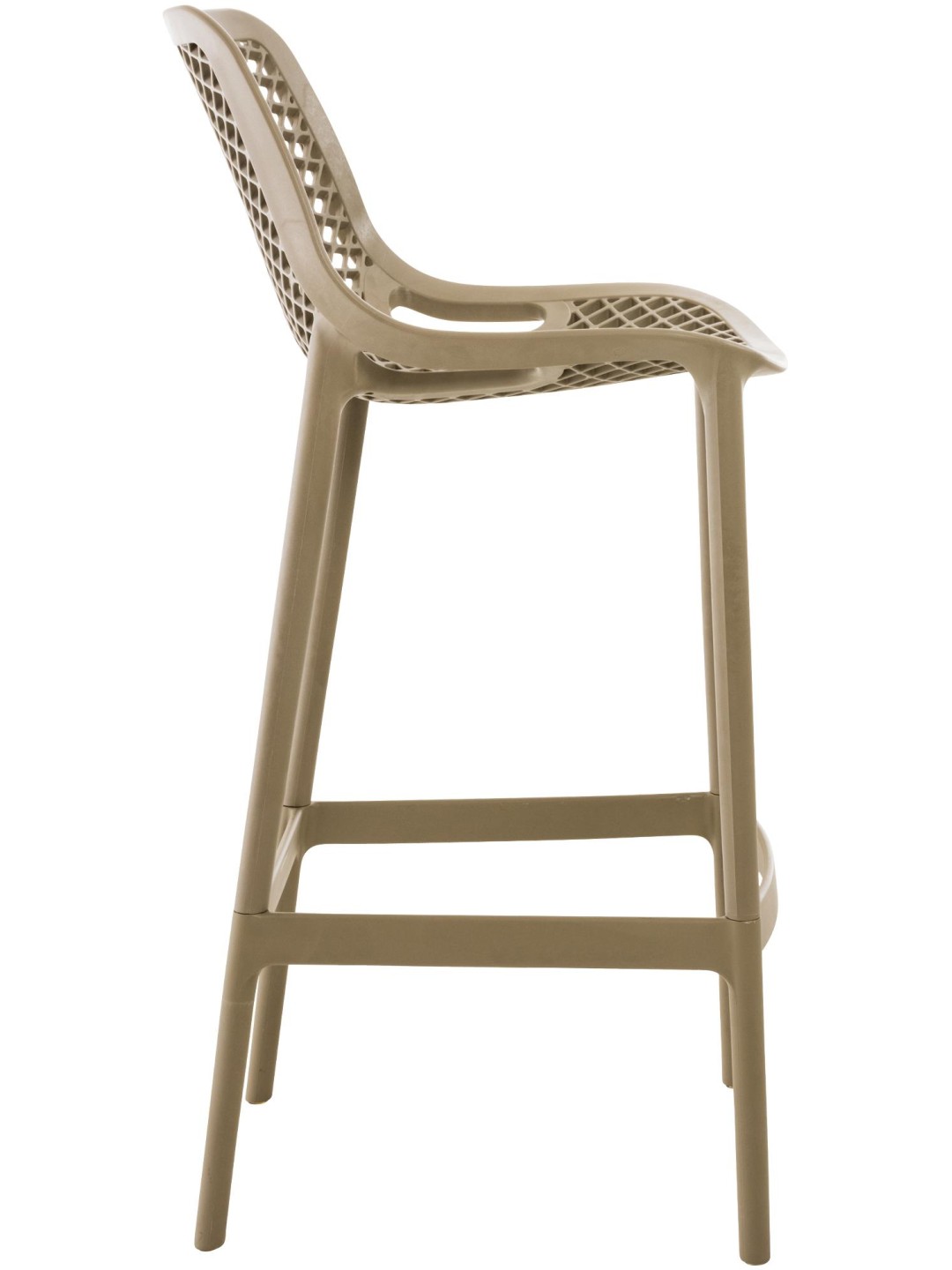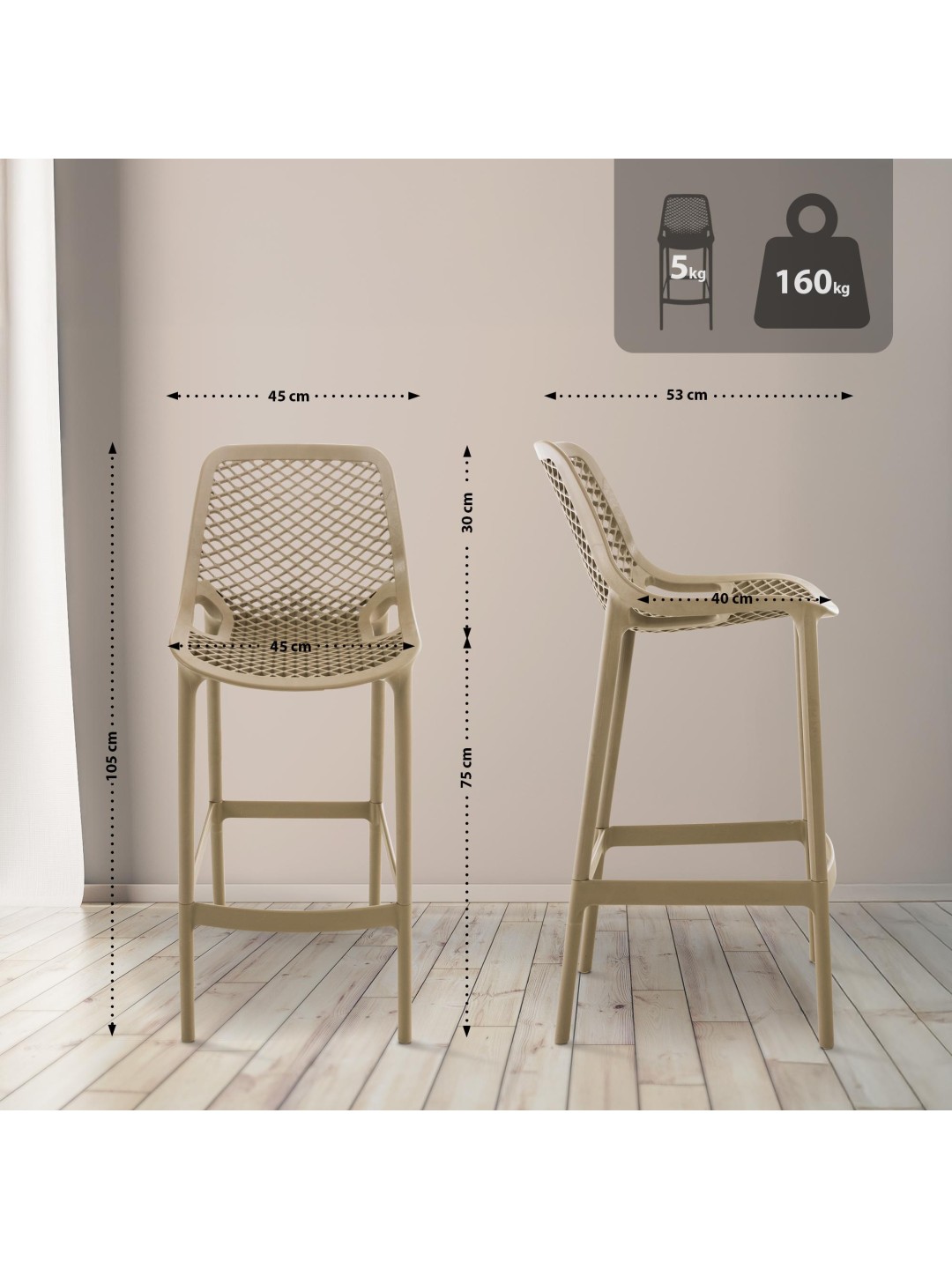 Fabricado en polipropileno de alta calidad y resistente a los rayos UV, el taburete de bar Air convence por su resistencia a la intemperie. Esto significa que la silla se puede utilizar no sólo en interiores sino también en exteriores. Por lo tanto, la silla también es una excelente opción como silla de jardín, para la terraza o el balcón.