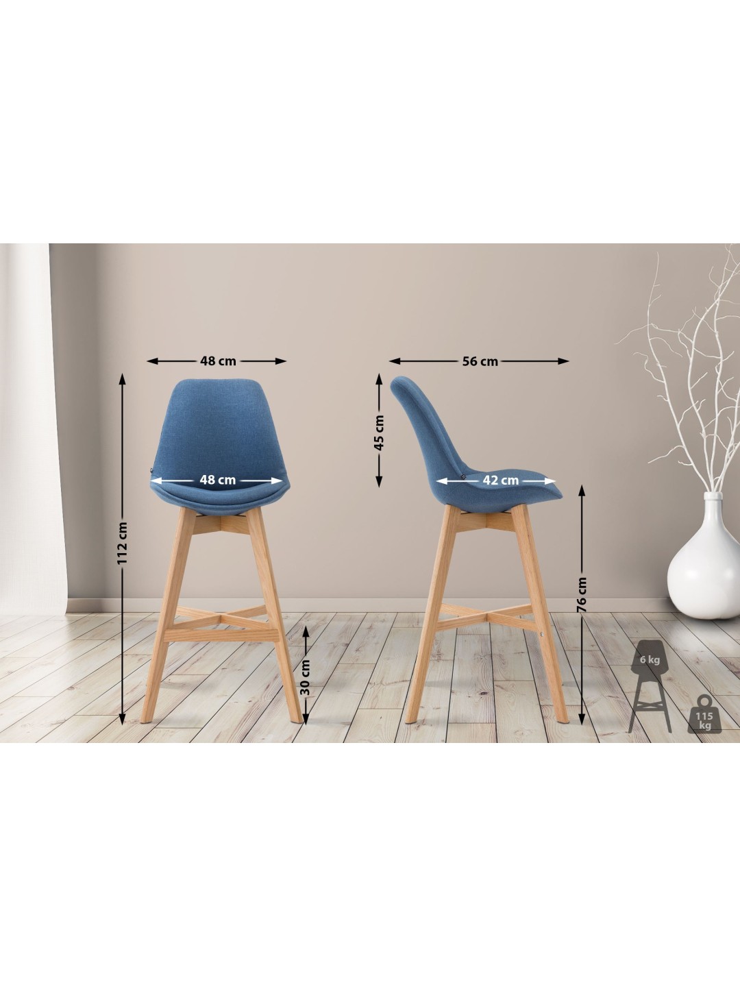 La estructura está hecha de roble, que es ideal para la construcción de muebles debido a su estabilidad. Las patas del taburete se estabilizan mediante travesaños sobre los que se pueden colocar los pies para relajarse. Para que los suelos delicados no se rayen, las cuatro patas de la silla tienen protectores de suelo de plástico.